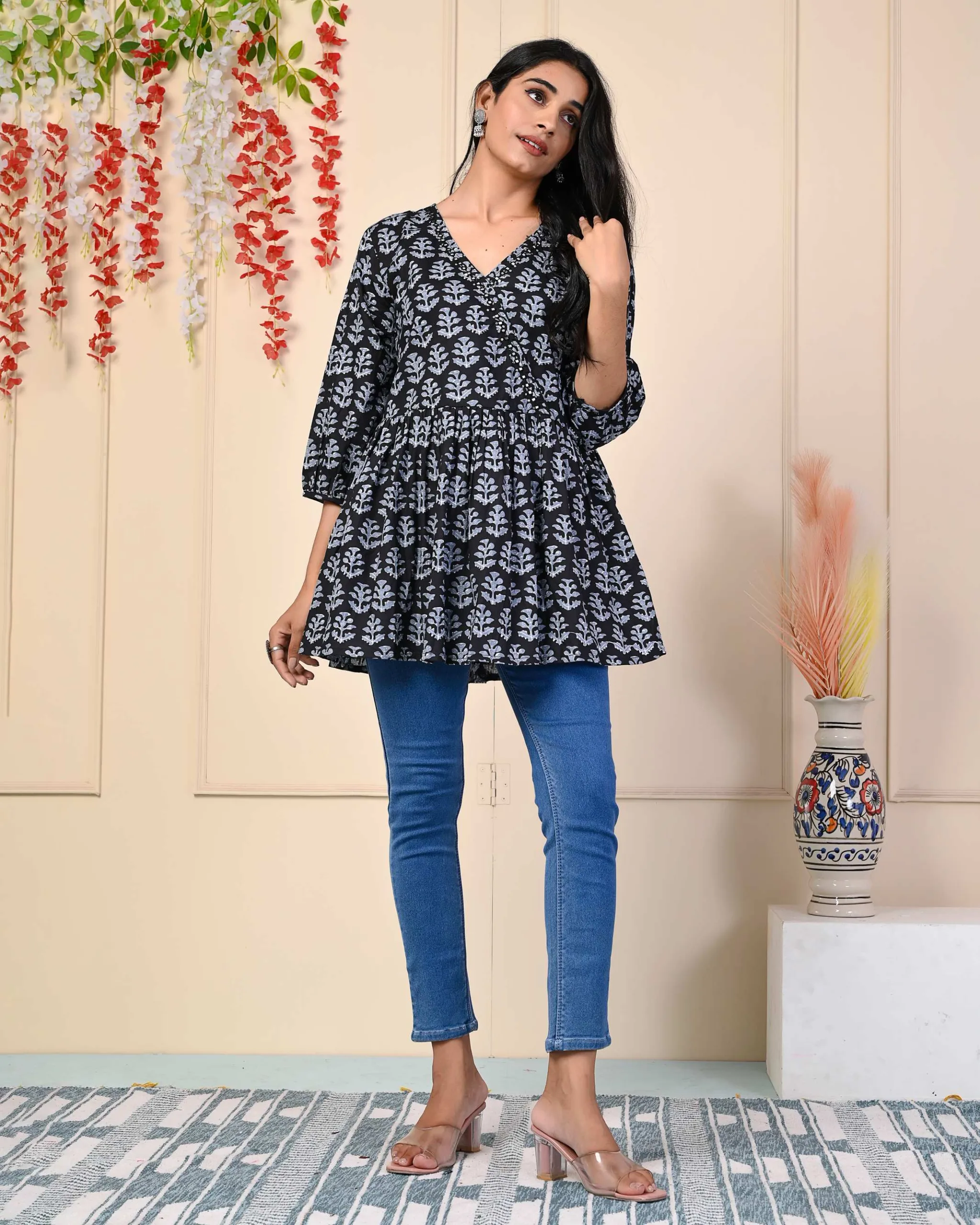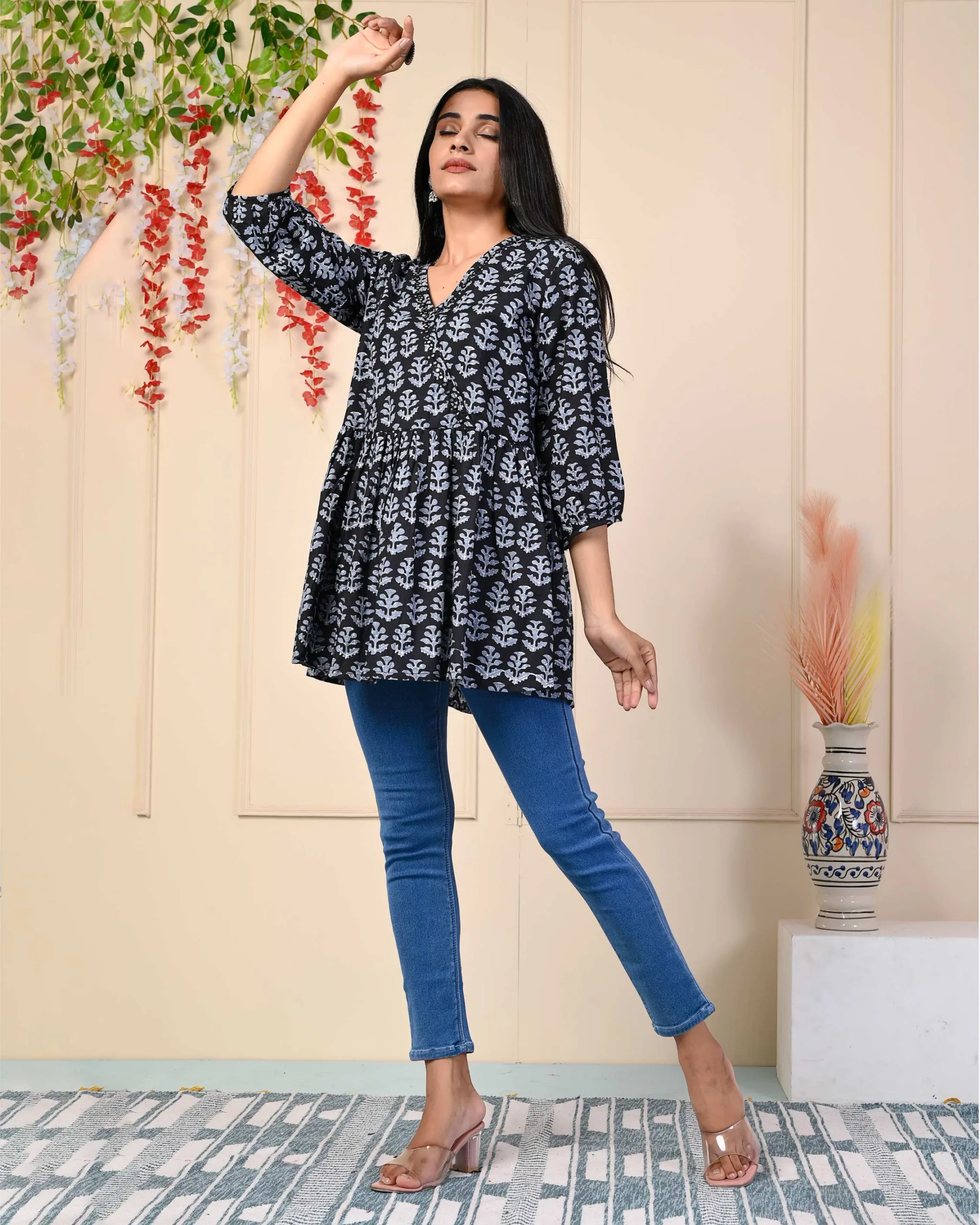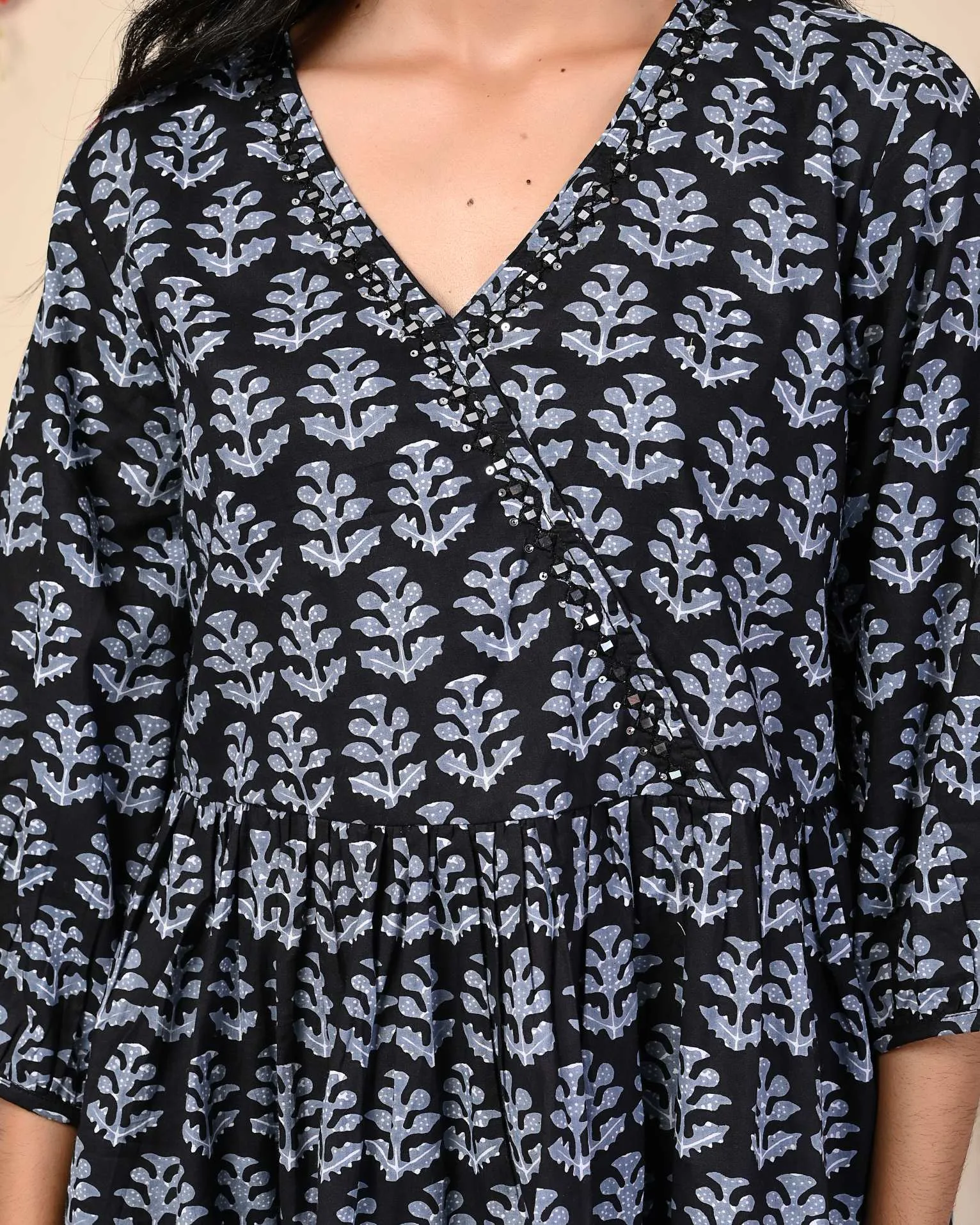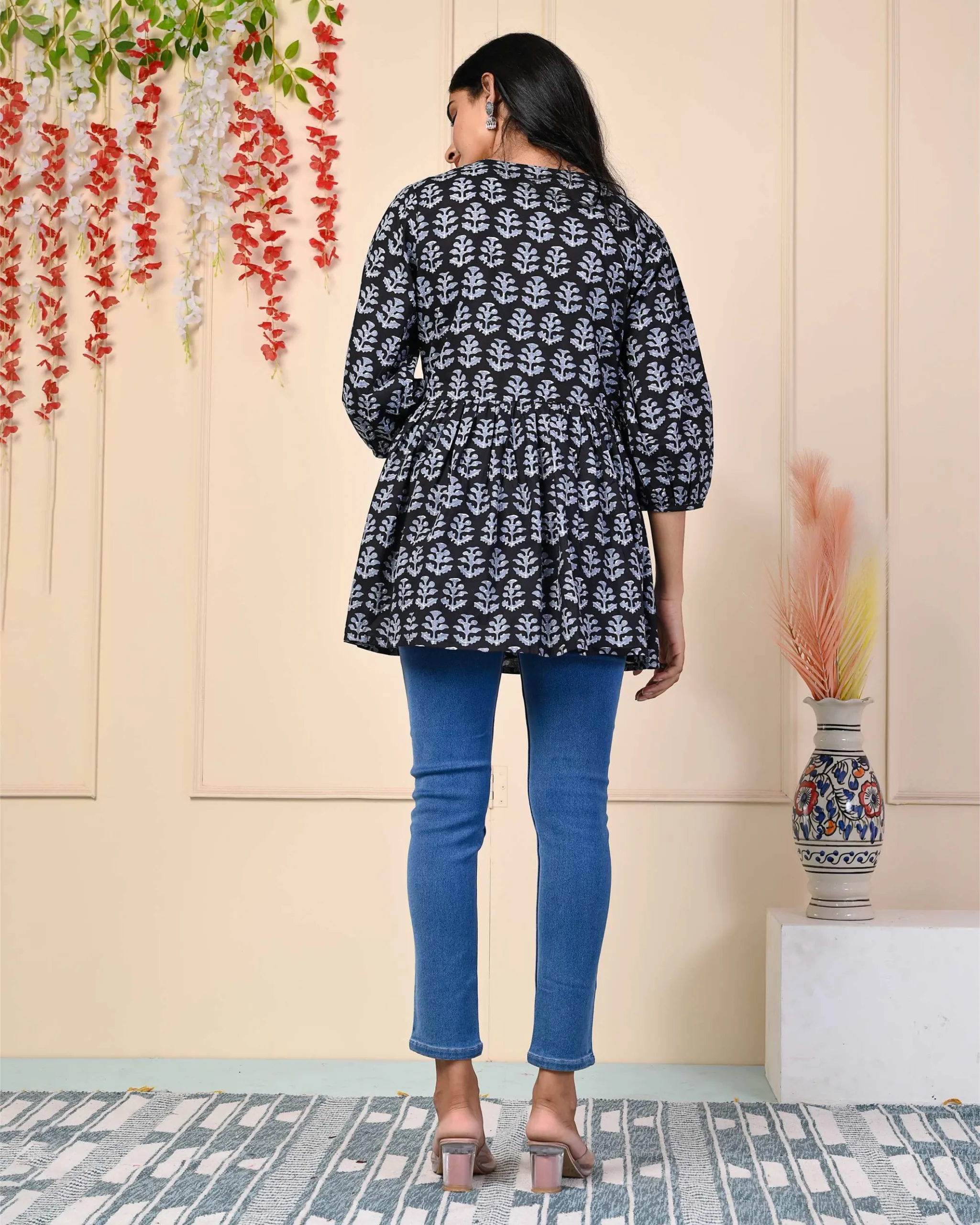 “Indulge in Style Black angrakha top with peplum detailing block Print Cotton Top, It Has Printed All Over and Fold Sleeves, it has three-fourth sleeves. Best Suited for Formal and Informal Gatherings, You Can Wear It with Cotton Pants, Denims, or Leggings.