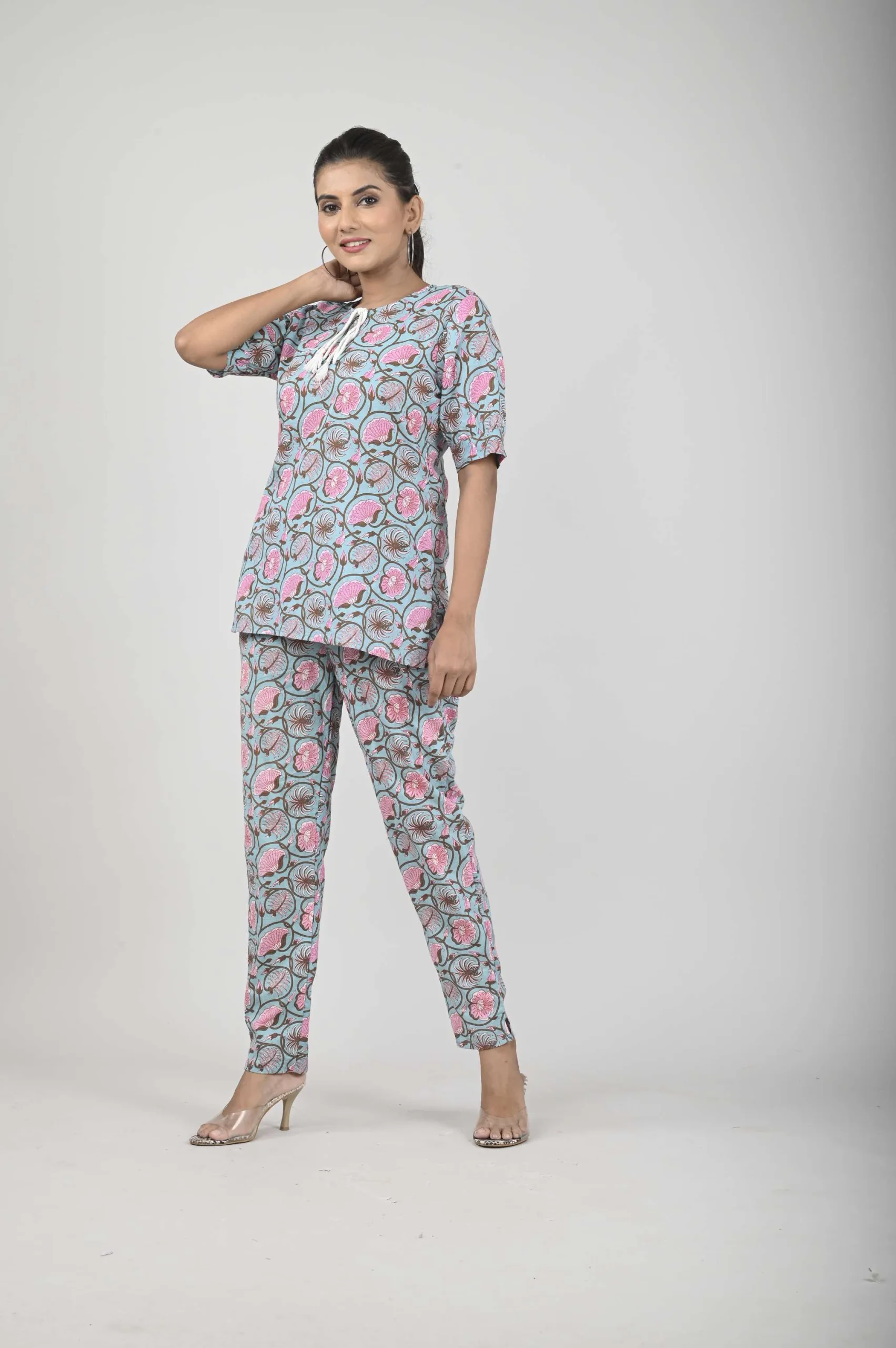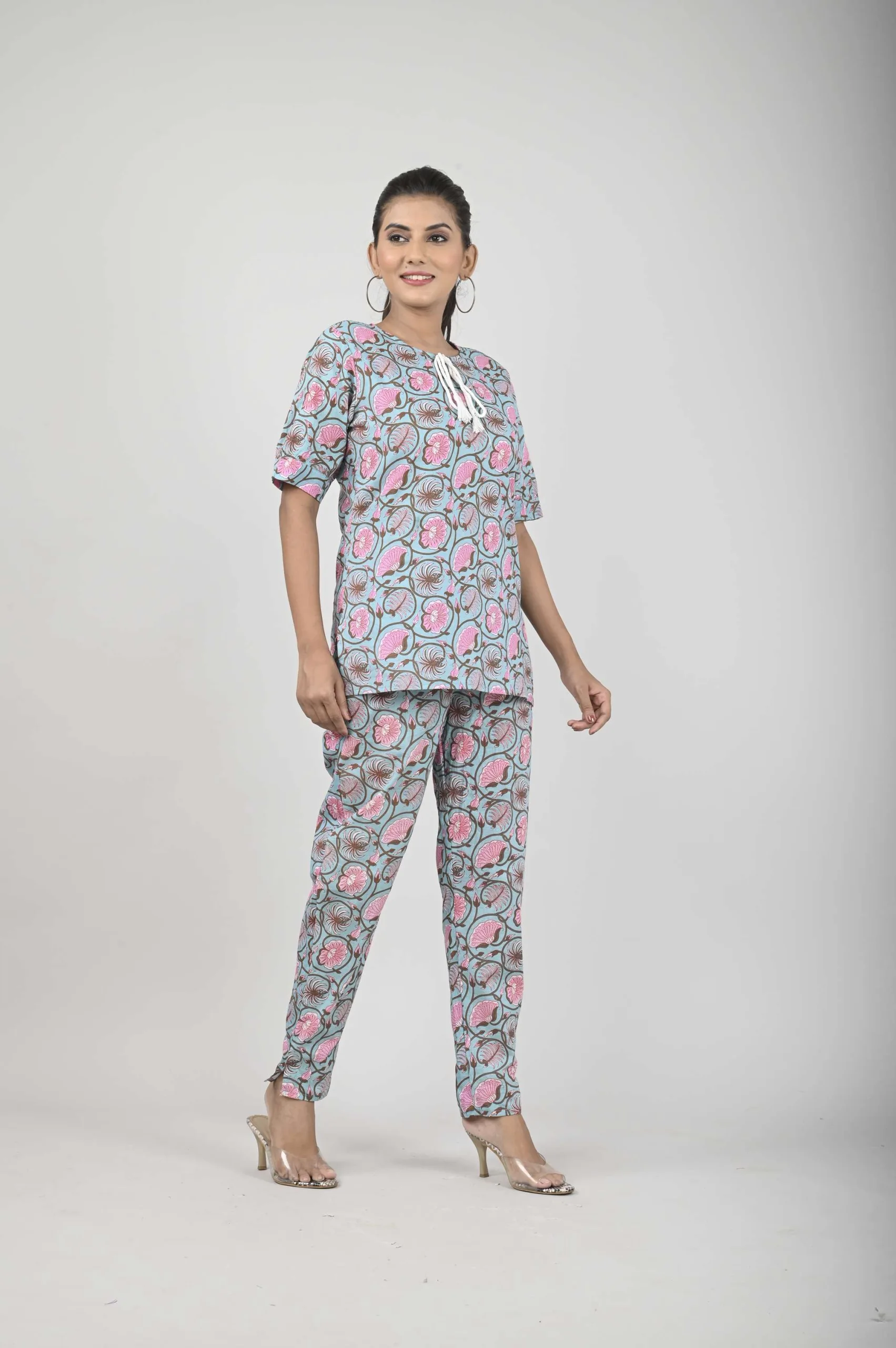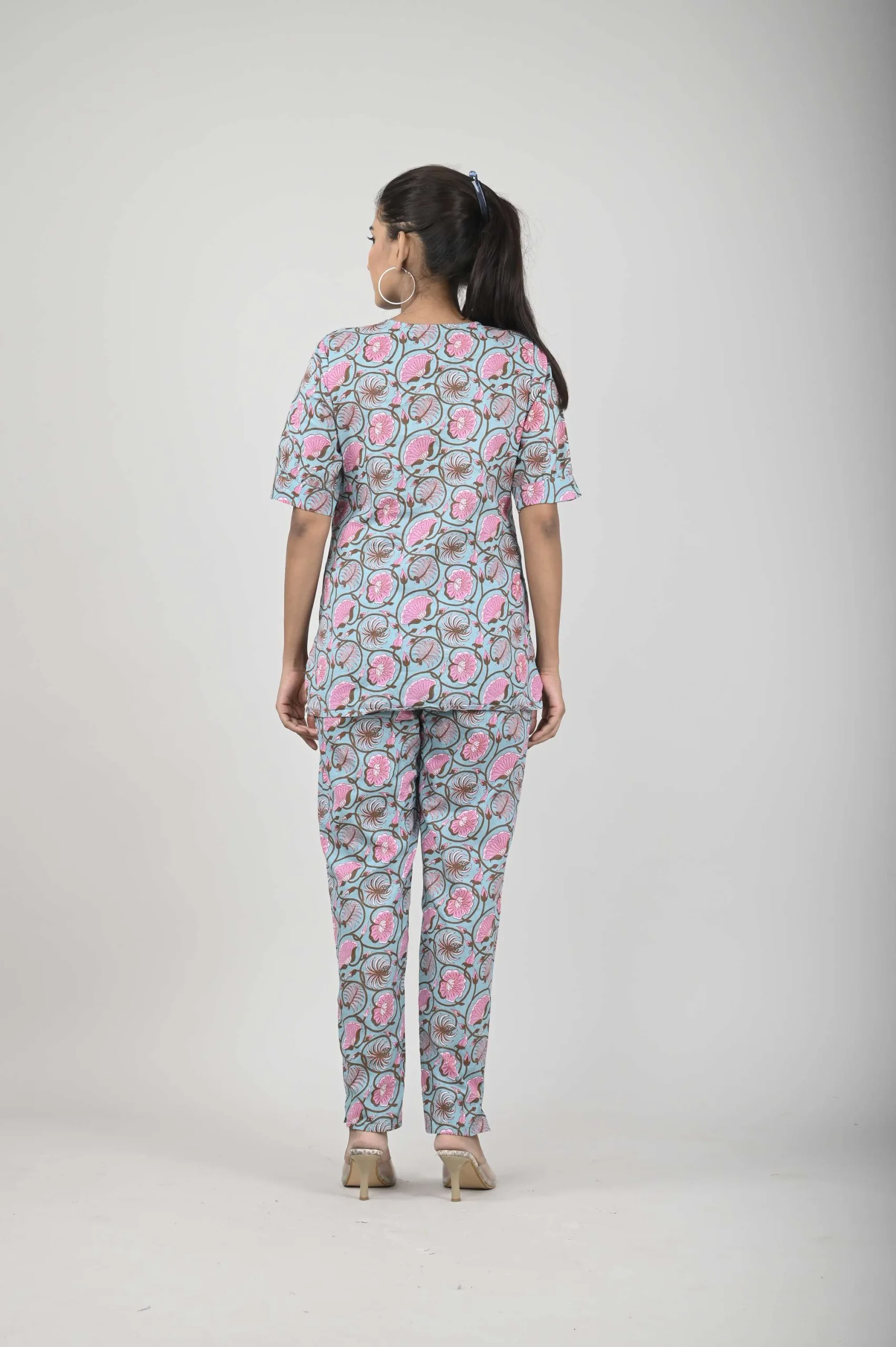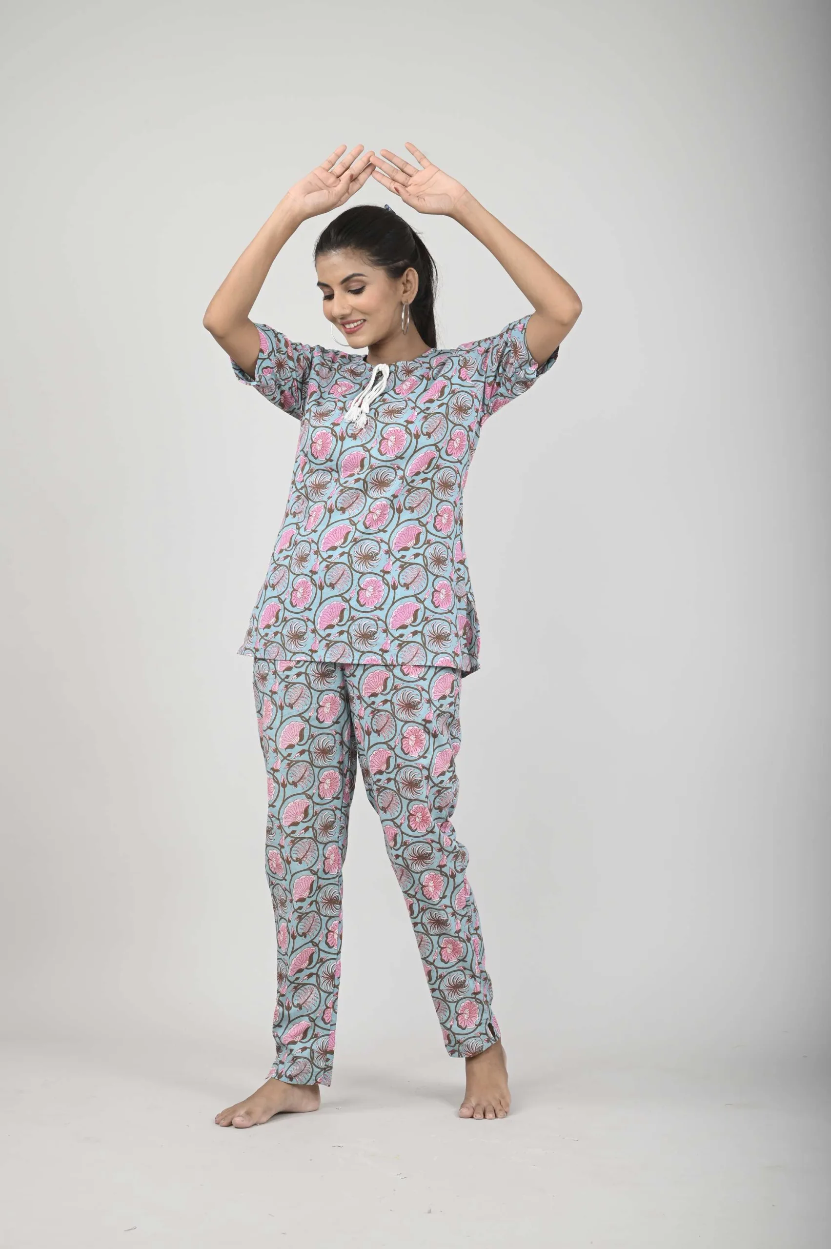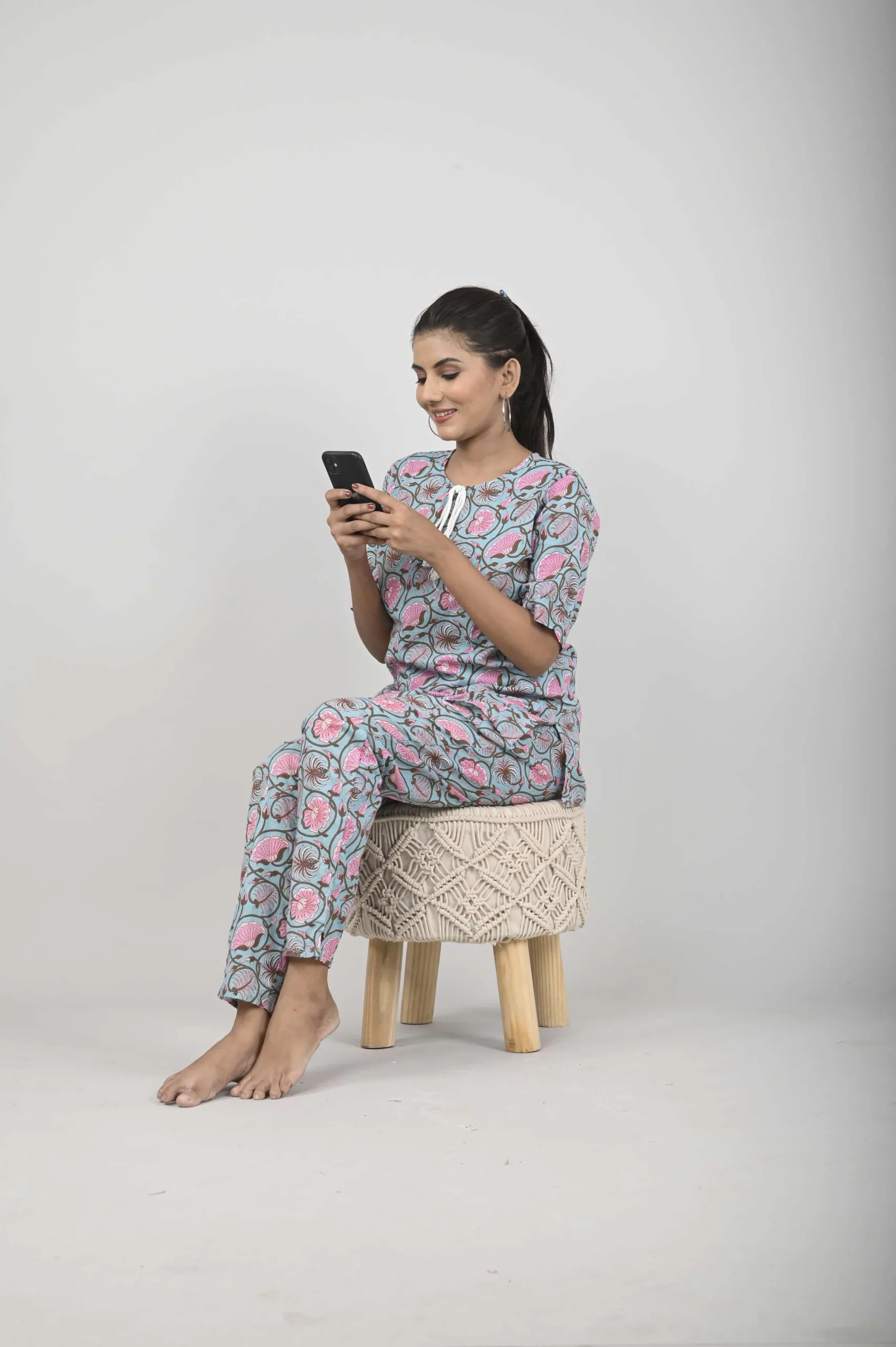 What Can Be More Flattering a Loungewear / Night Wear That Is Comfortable to Slip in And Also Very Stylish to Look At, With sky blue Floral Printed Nightwear You Just Have Your Basics Right! So,