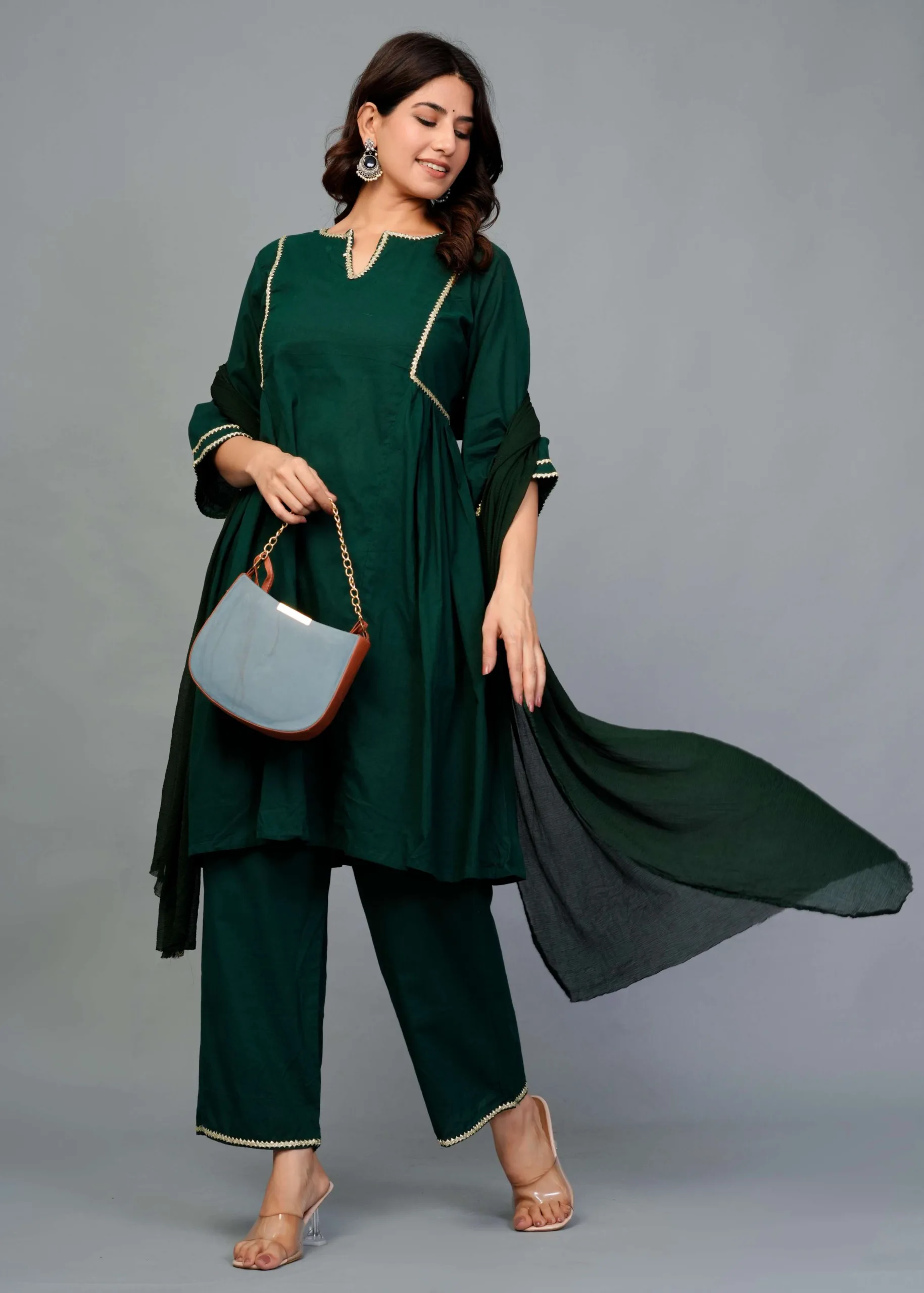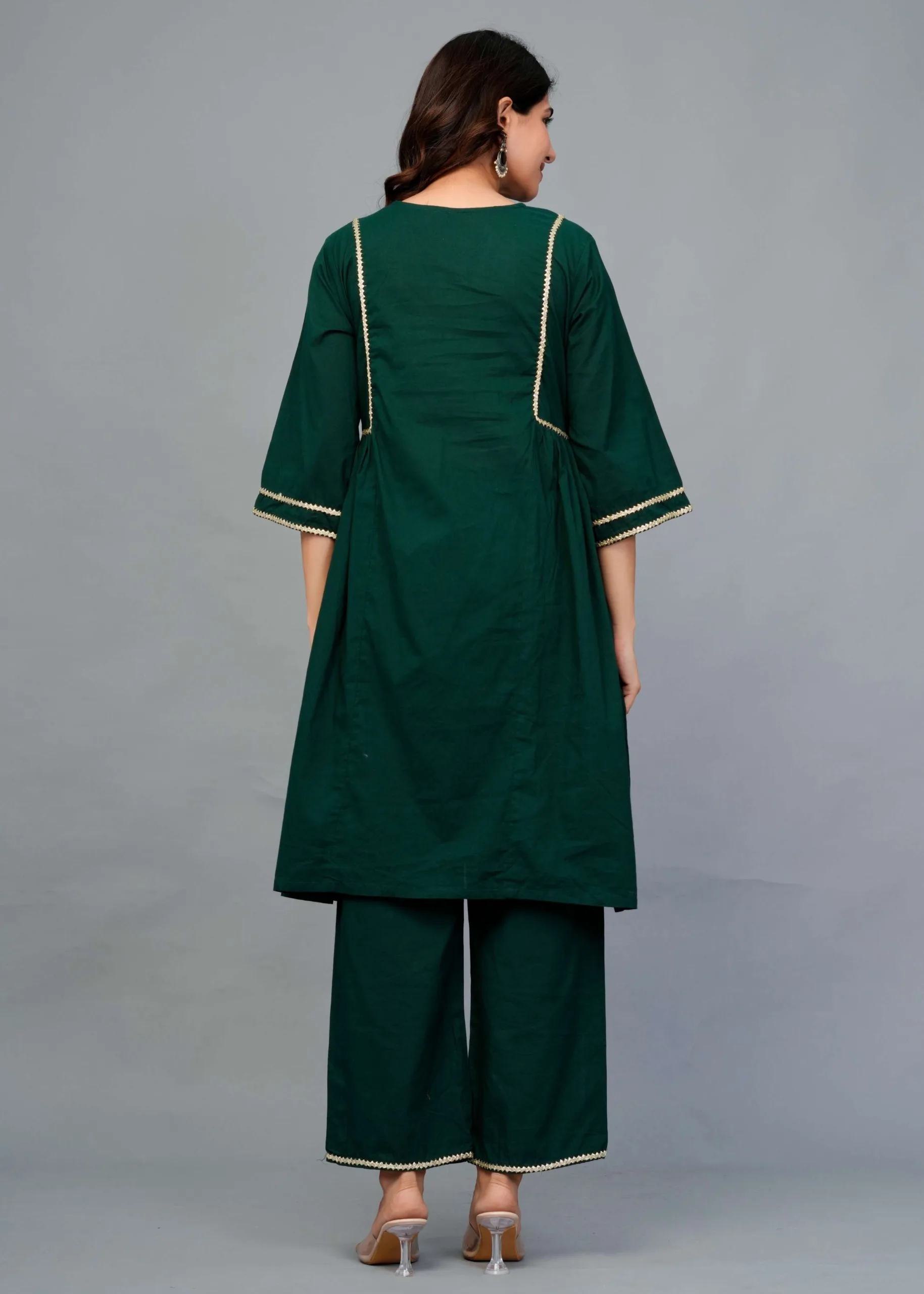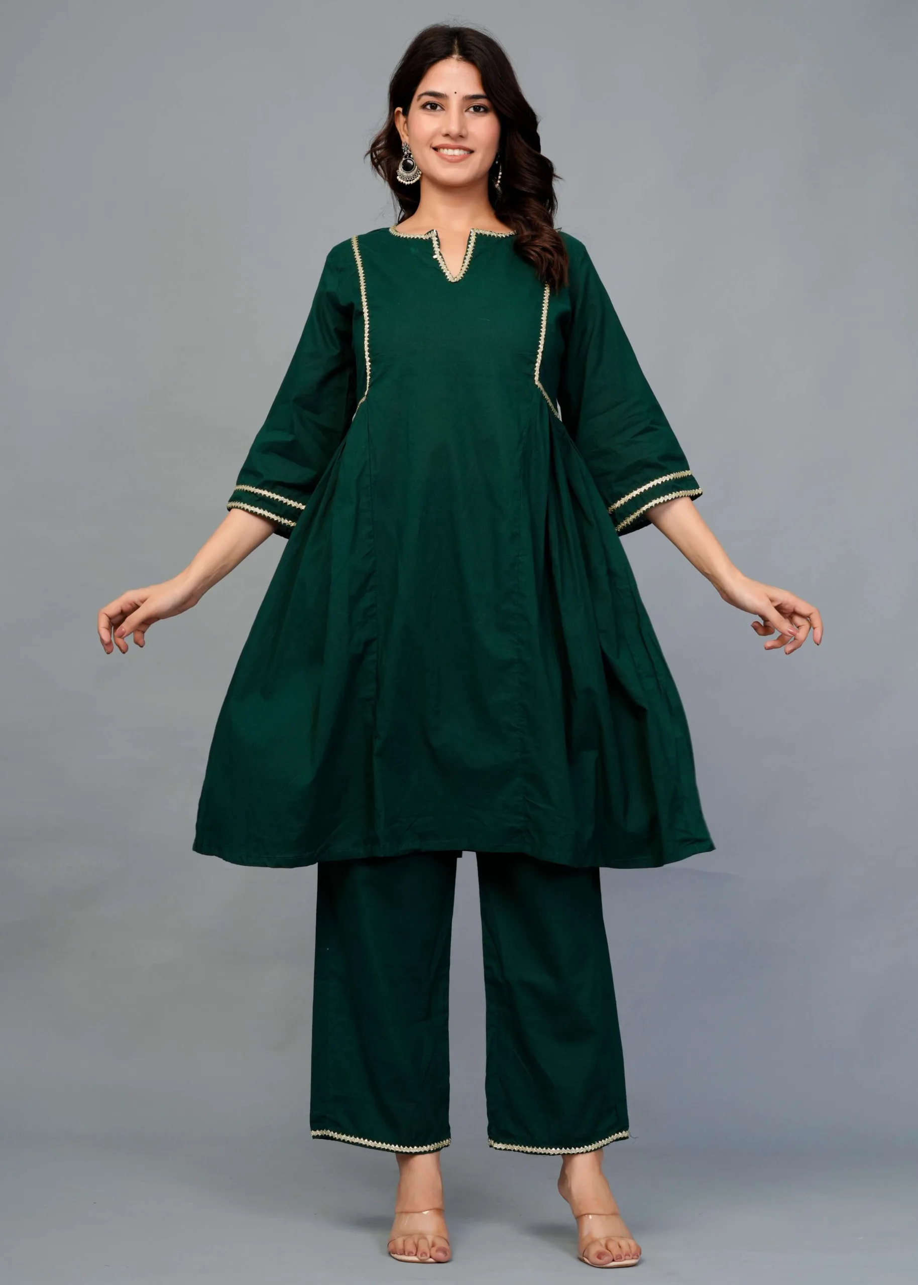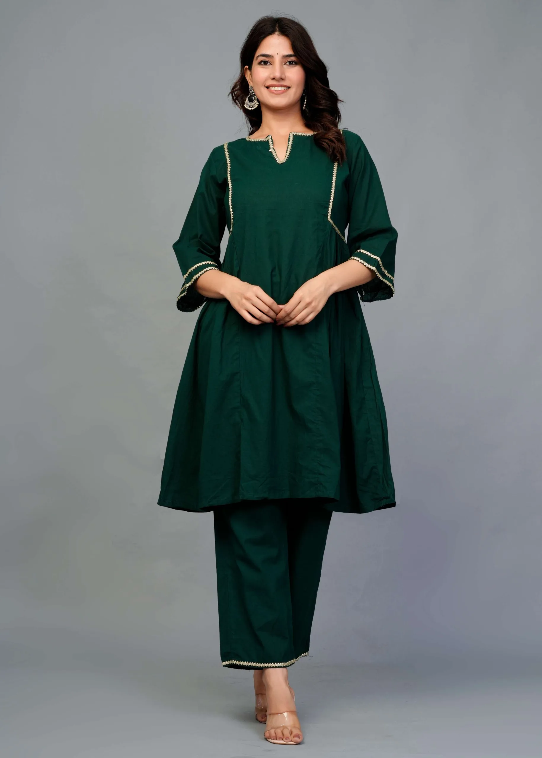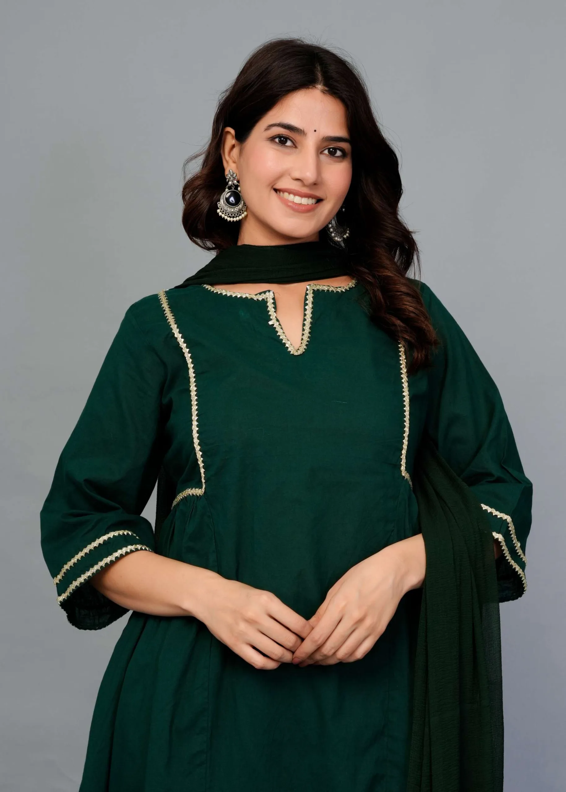 A timeless emerald green ensemble that exudes understated elegance. The A-line cotton kurta features a flared silhouette with a notched neckline and three-quarter sleeves. Intricate lace detailing along the neckline, sleeve edges, and side panels adds a delicate handcrafted charm to the minimalist look.