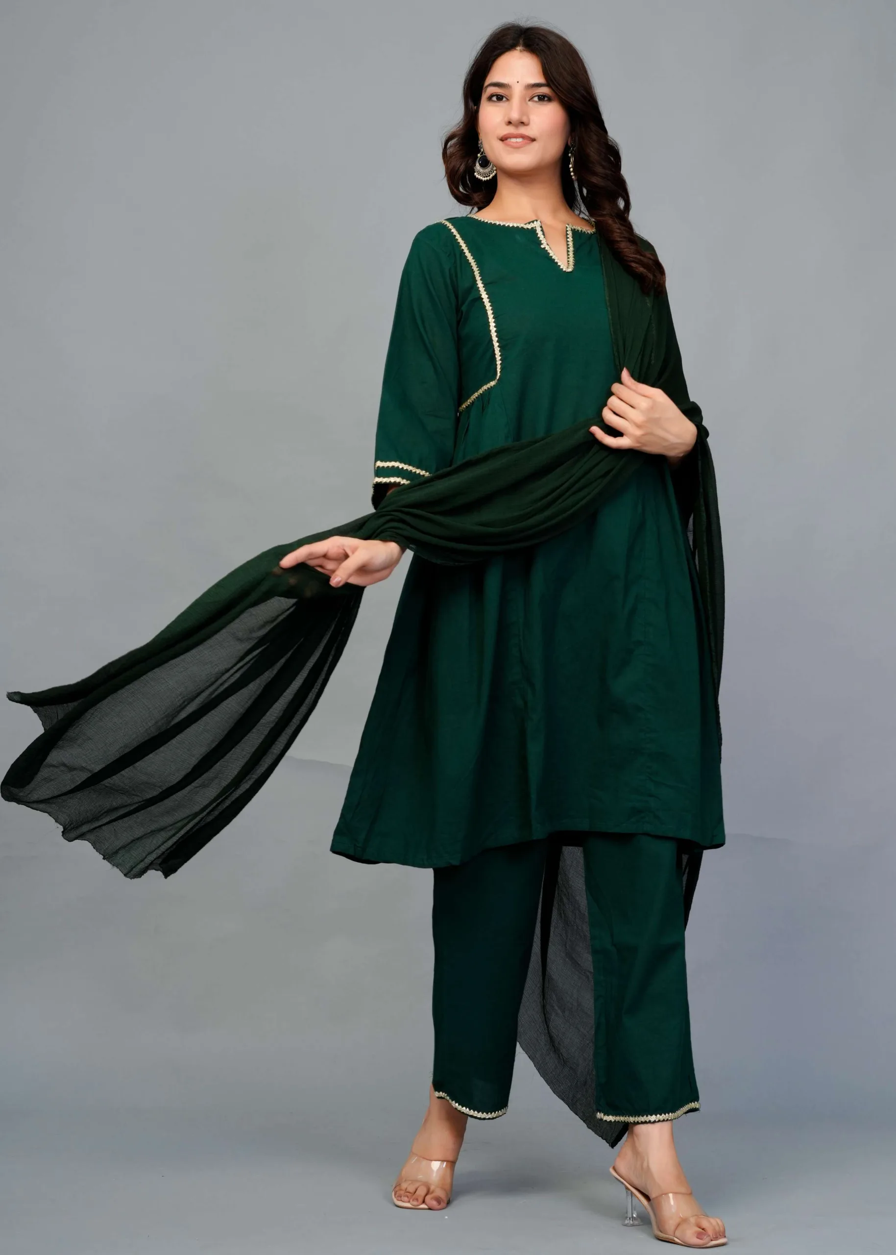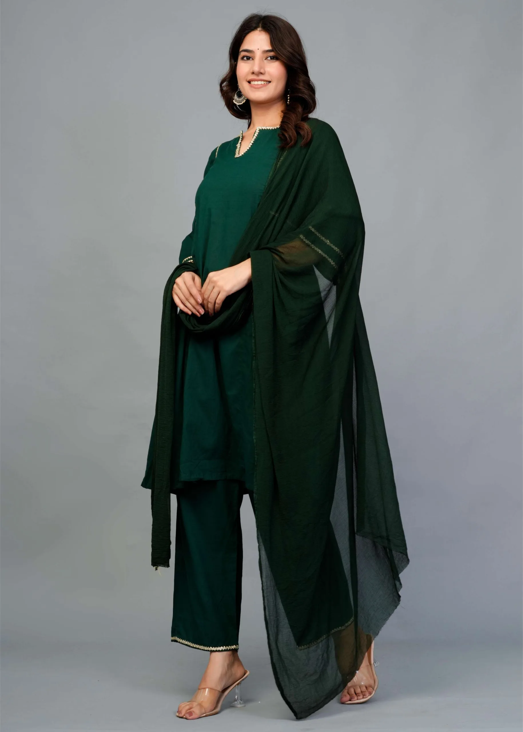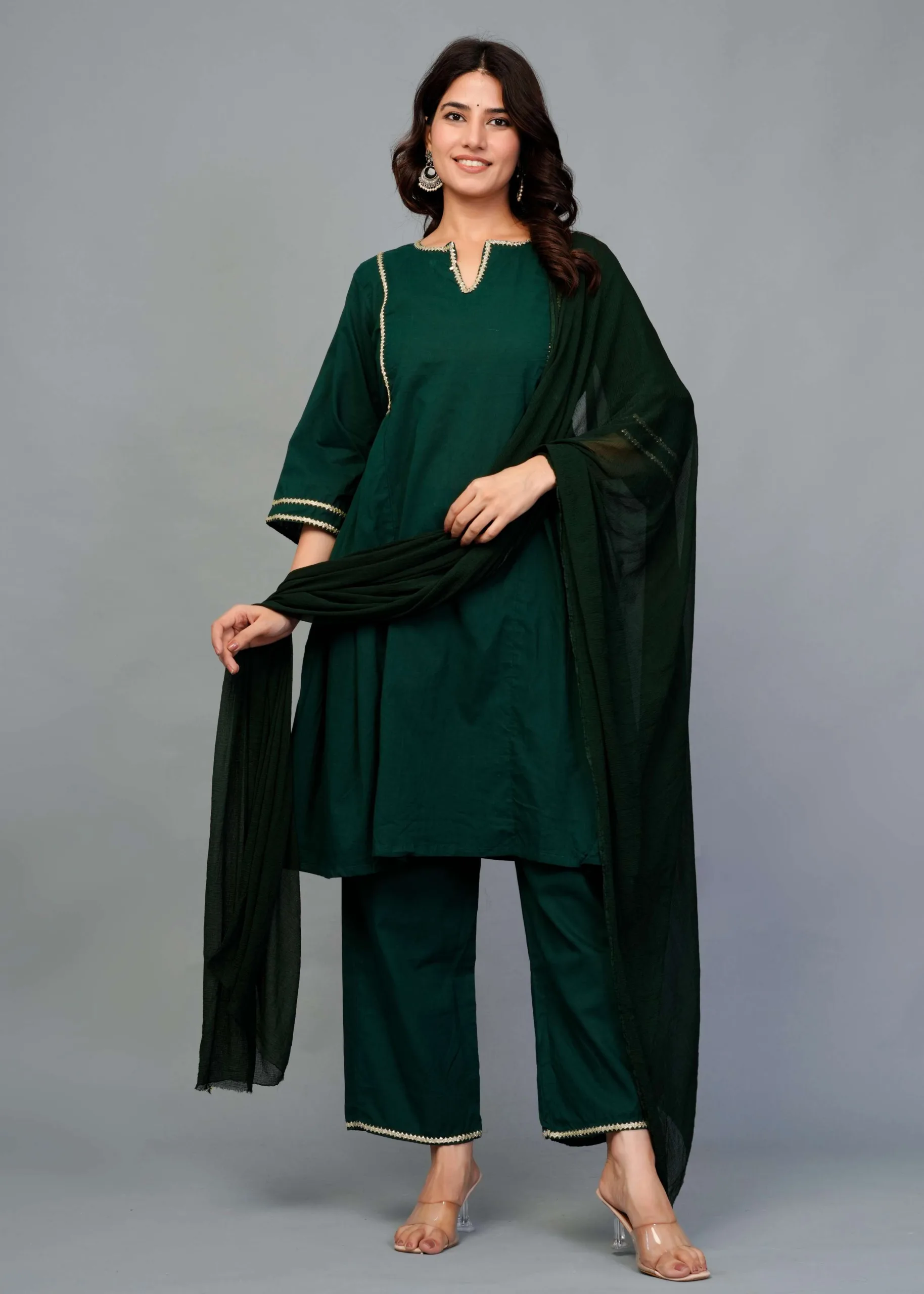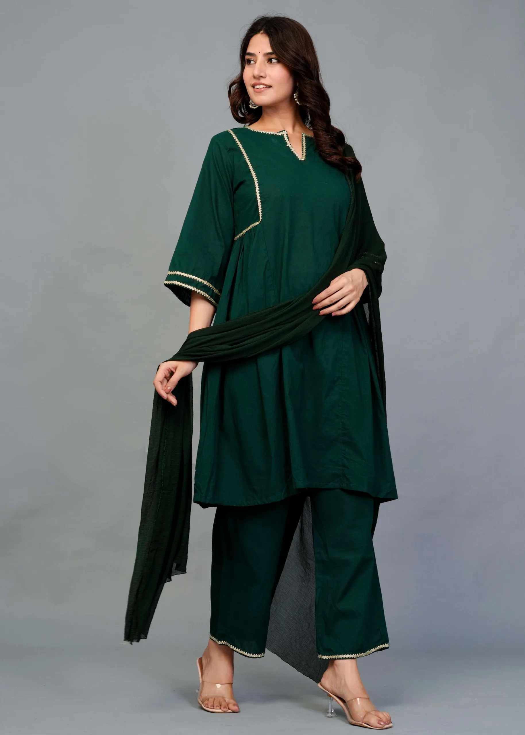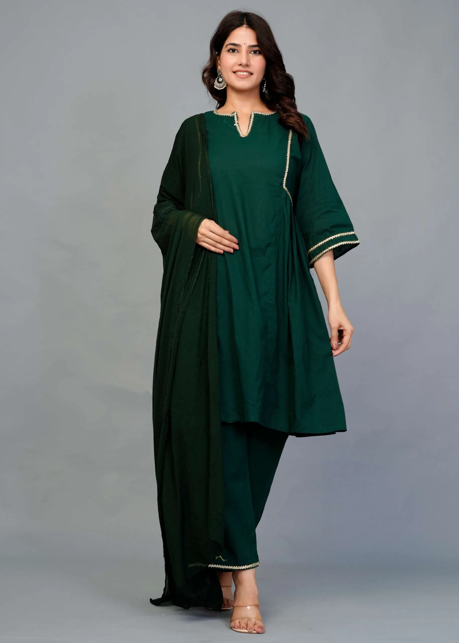 A timeless emerald green ensemble that exudes understated elegance. The A-line cotton kurta features a flared silhouette with a notched neckline and three-quarter sleeves. Intricate lace detailing along the neckline, sleeve edges, and side panels adds a delicate handcrafted charm to the minimalist look.