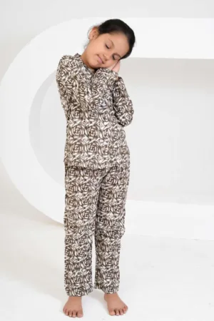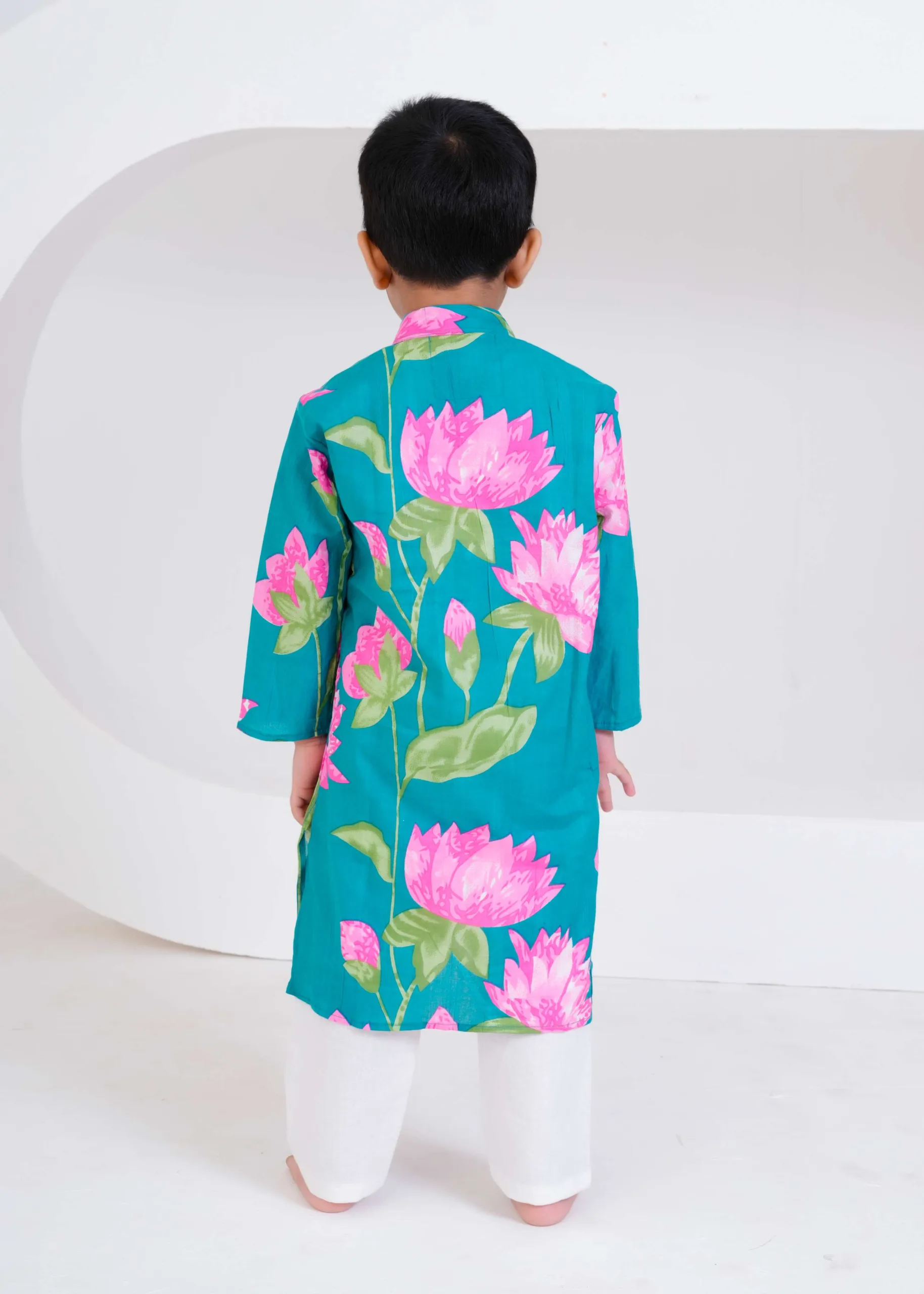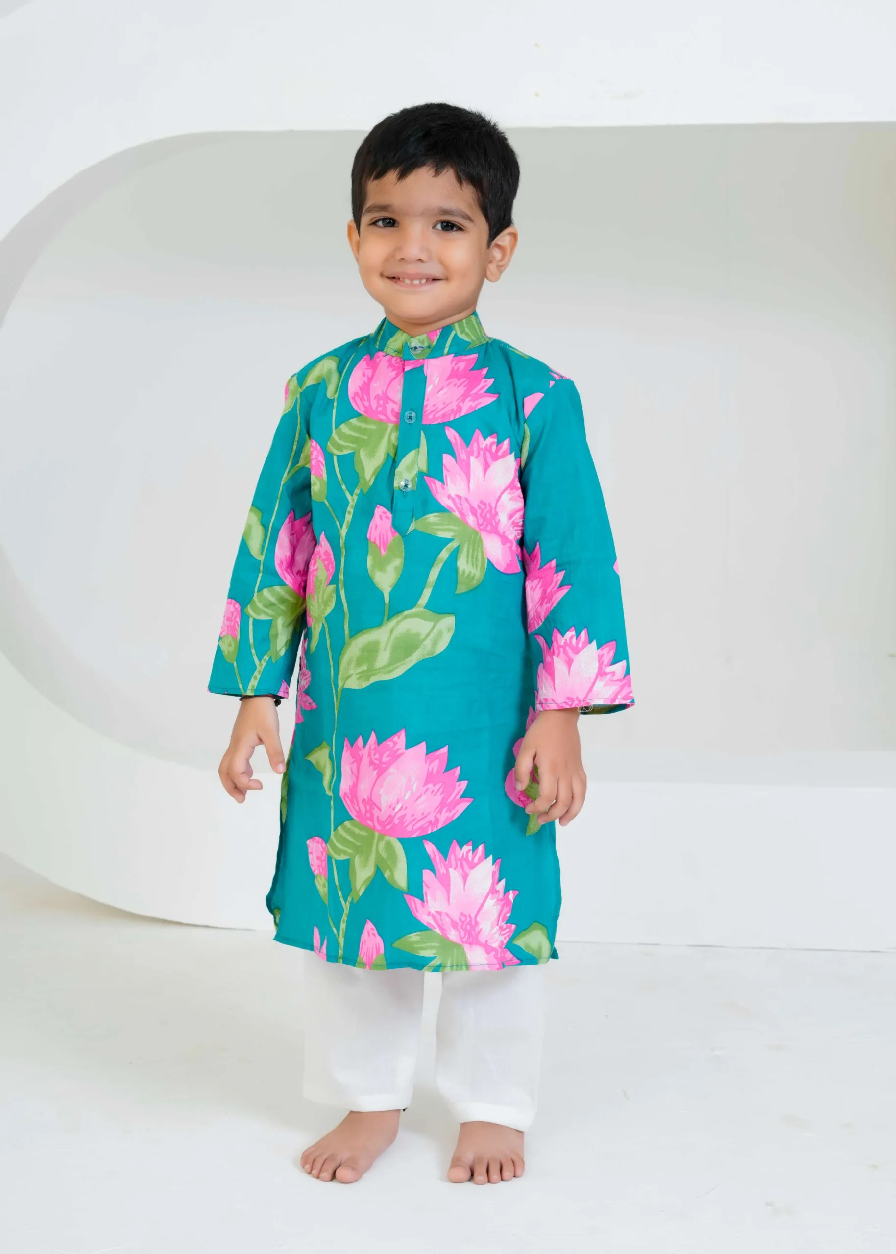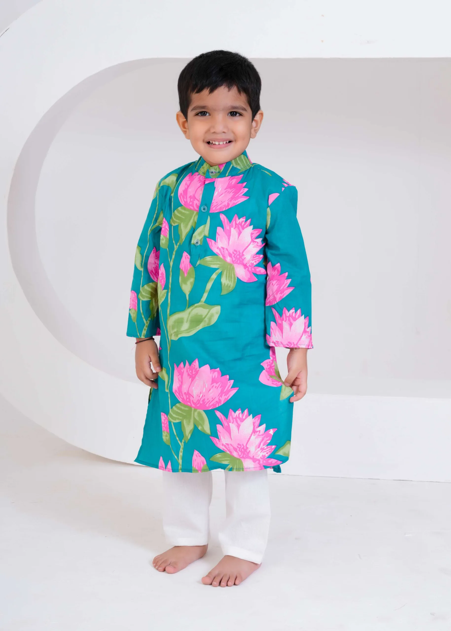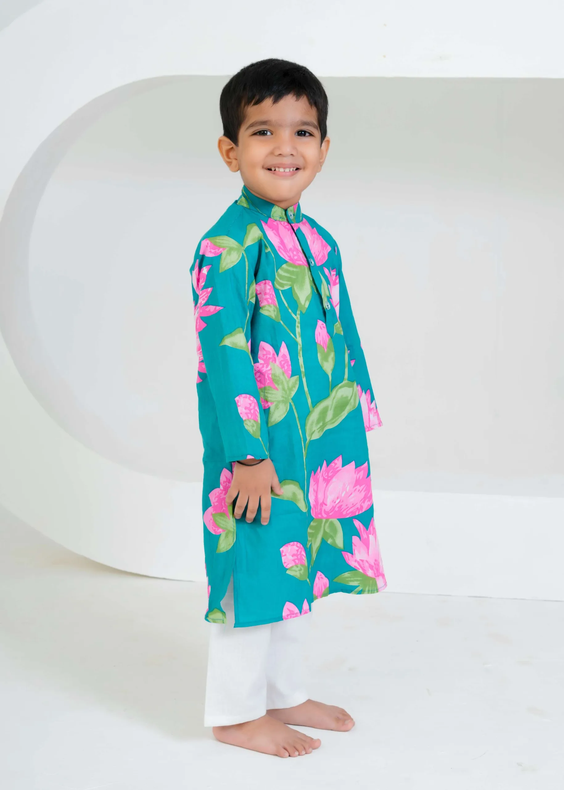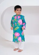 “Bursting with color and joy, this teal lotus print kurta set brings freshness to festive dressing. The bold pink florals and soft cotton comfort make it perfect for your little one’s celebrations and happy moments.”