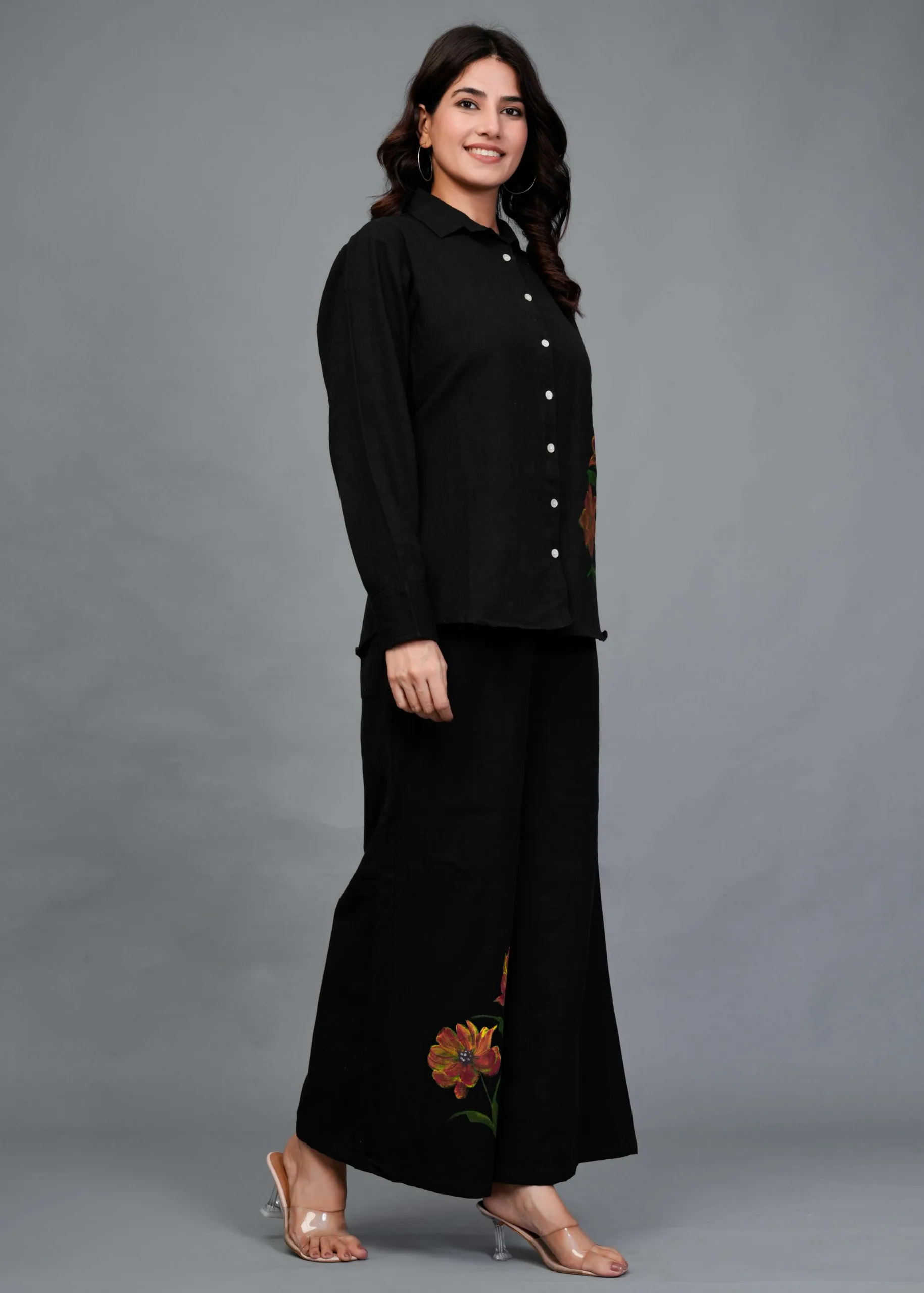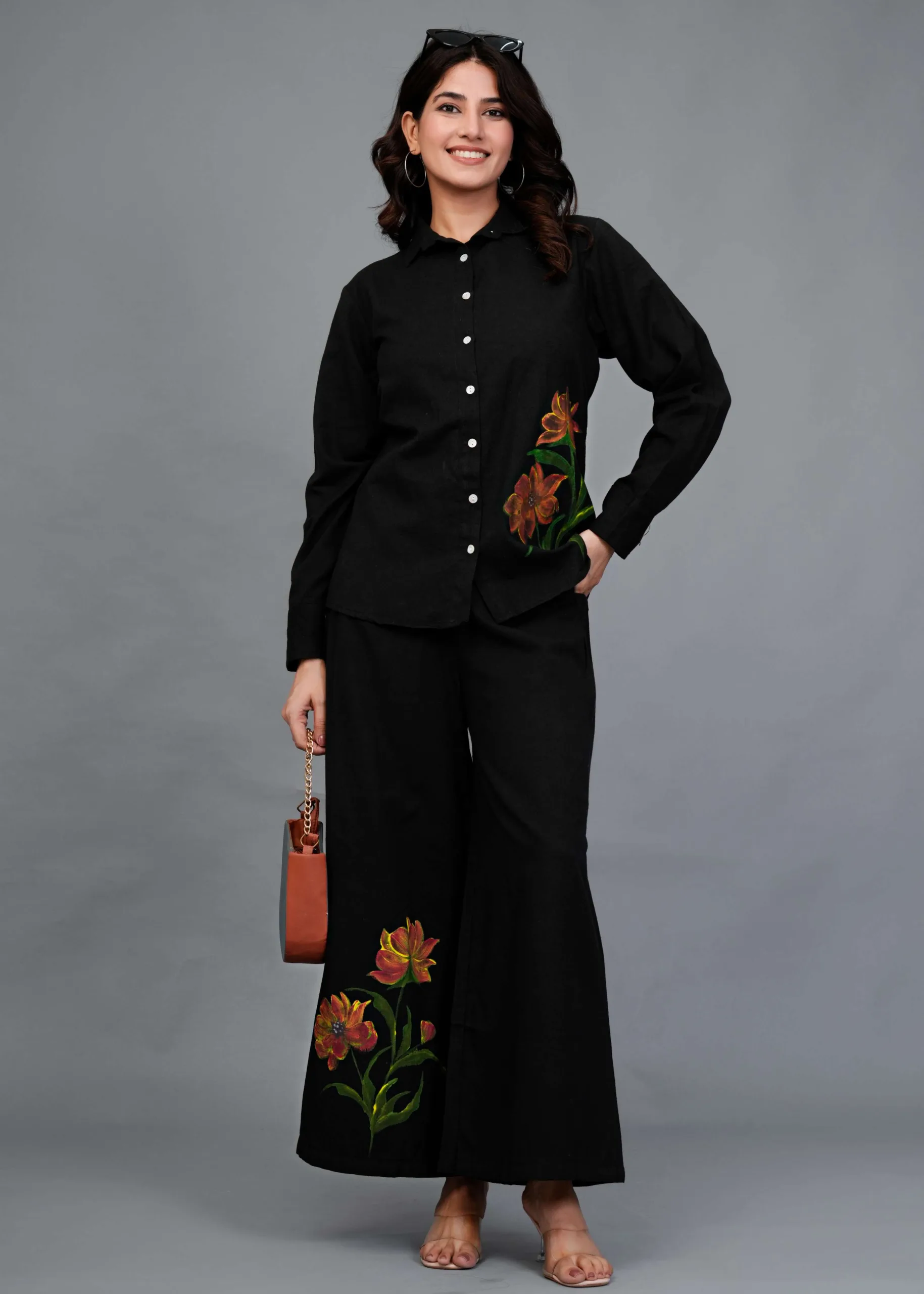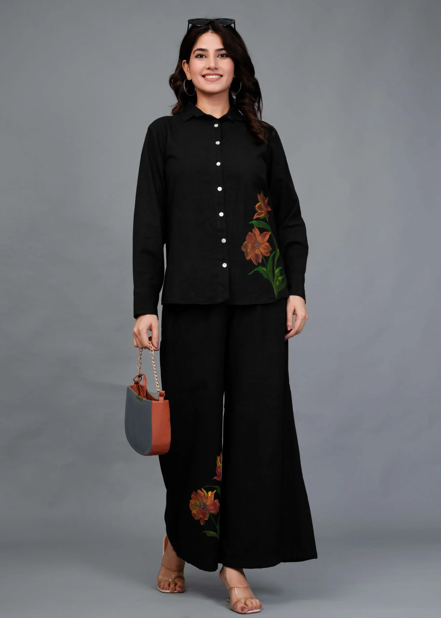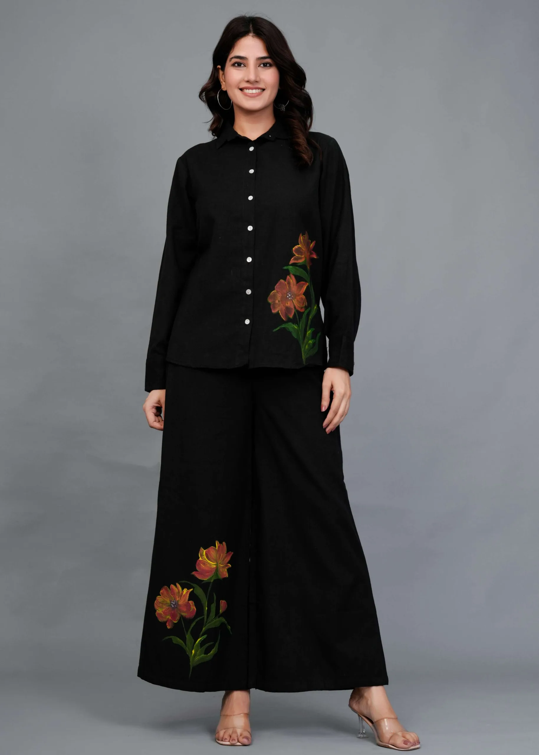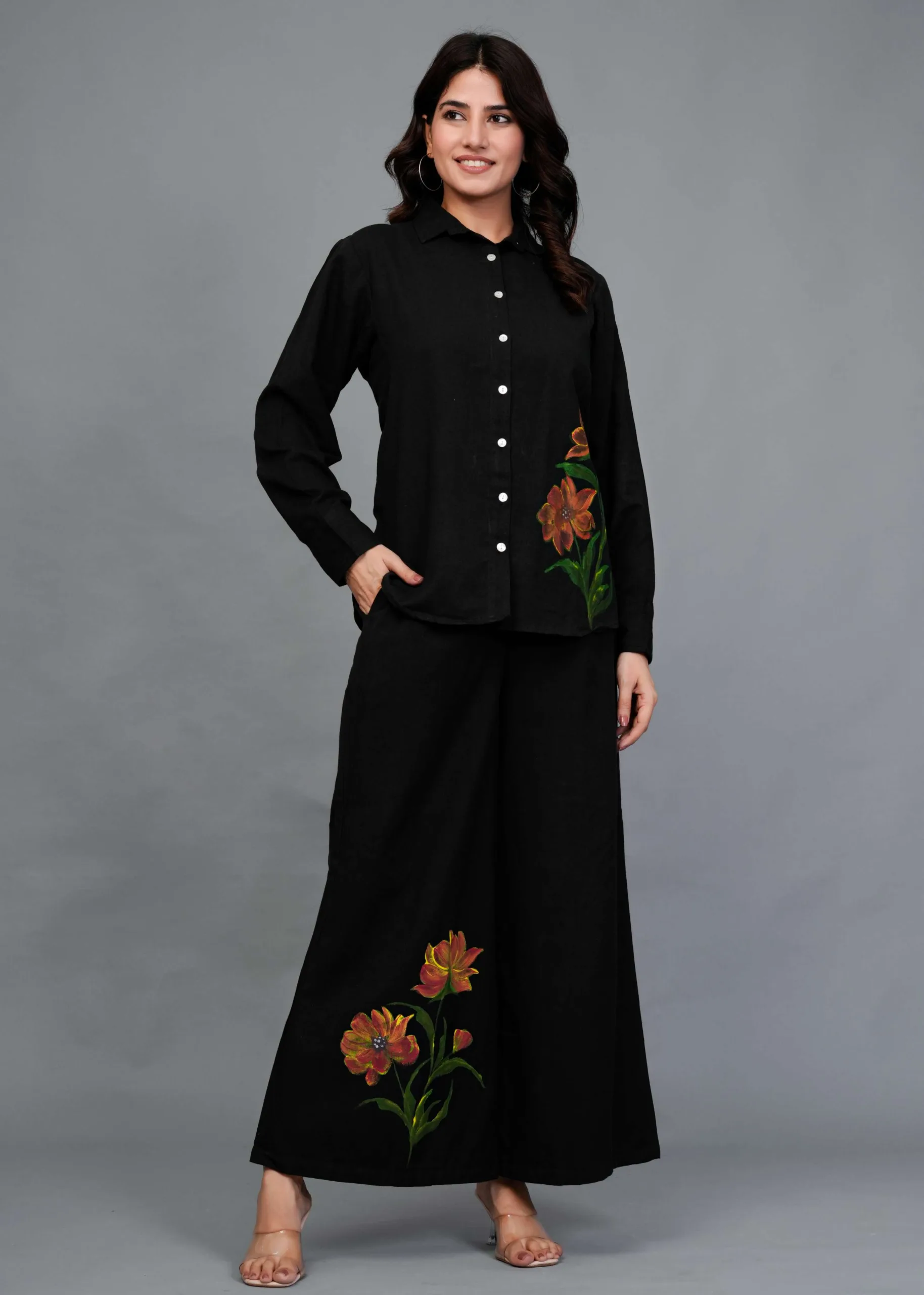 This is a black co-ord set featuring a button-down shirt and wide-legged trousers. The highlight of this outfit is its hand-painted floral design — large, detailed blooms in warm tones of orange, rust, and yellow with green leaves, adding an artistic pop of color to the minimal black base. The shirt has a classic collar and full sleeves, while the pants have a relaxed, flowy silhouette, making it both stylish and comfortable. Perfect for casual brunches, art events, or statement everyday wear.