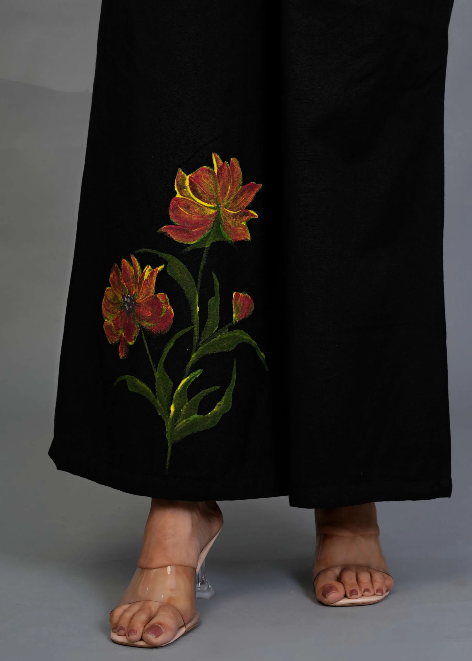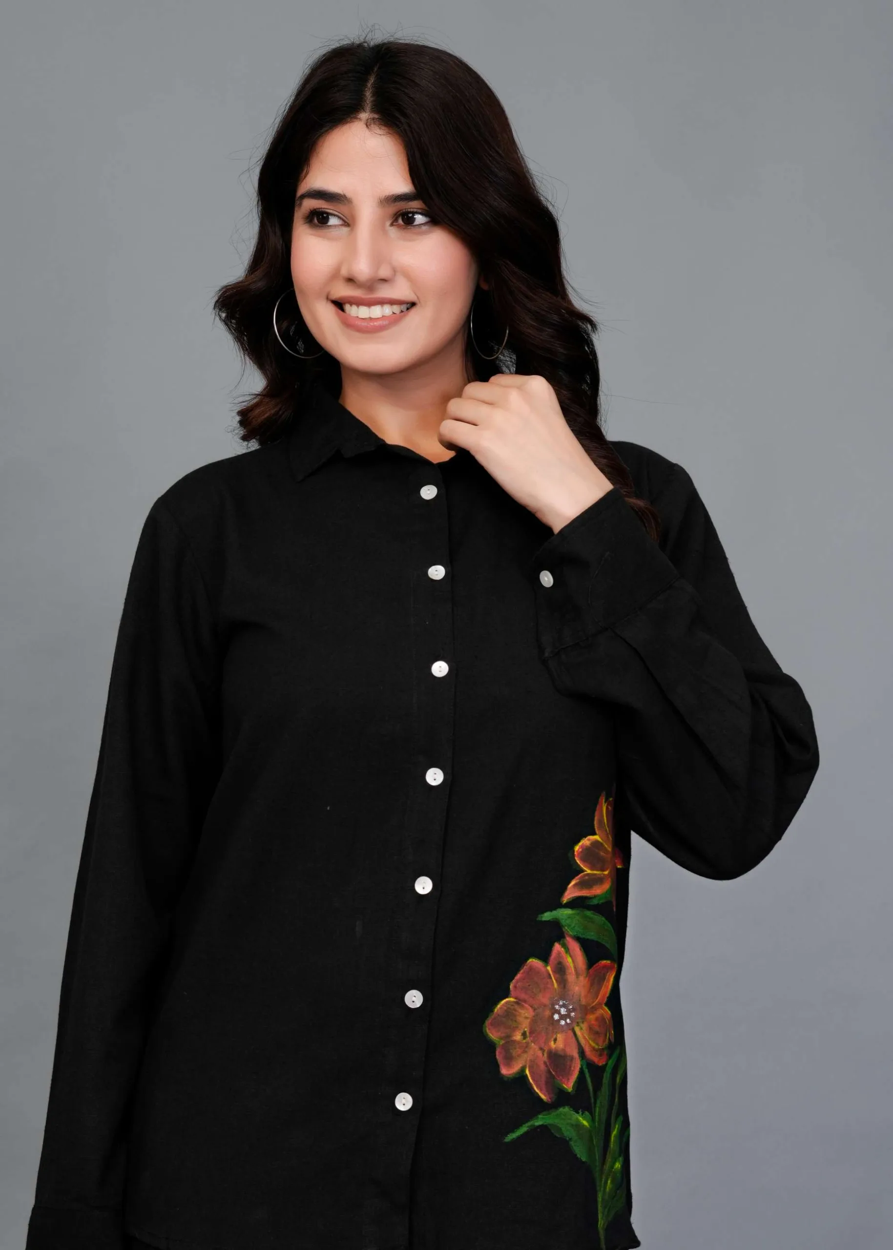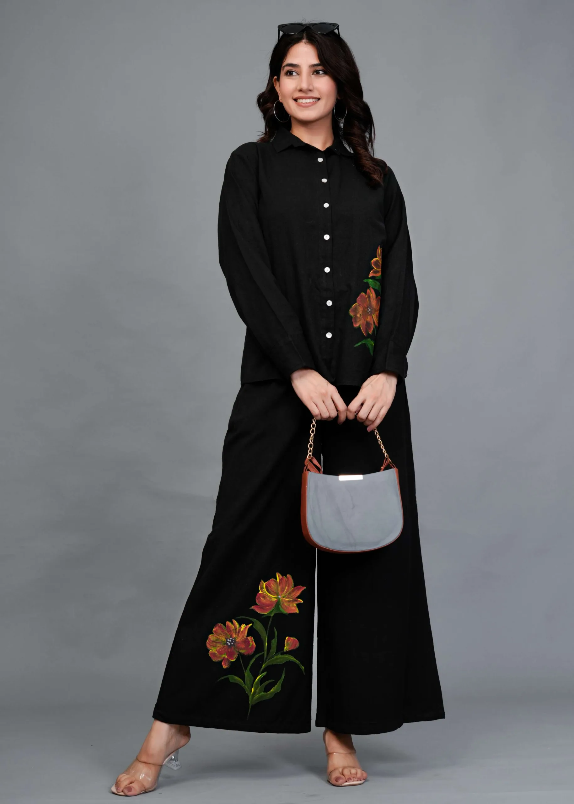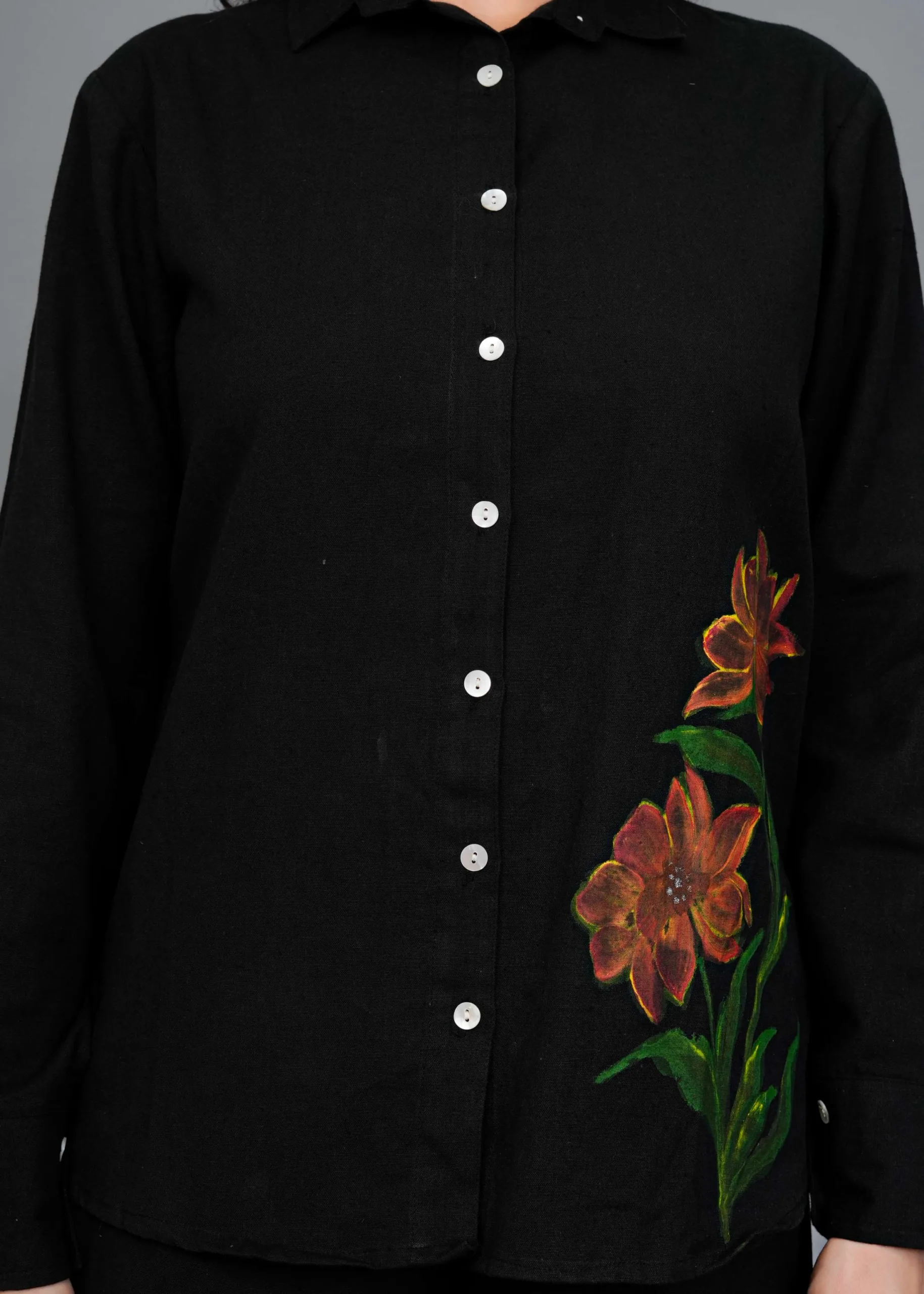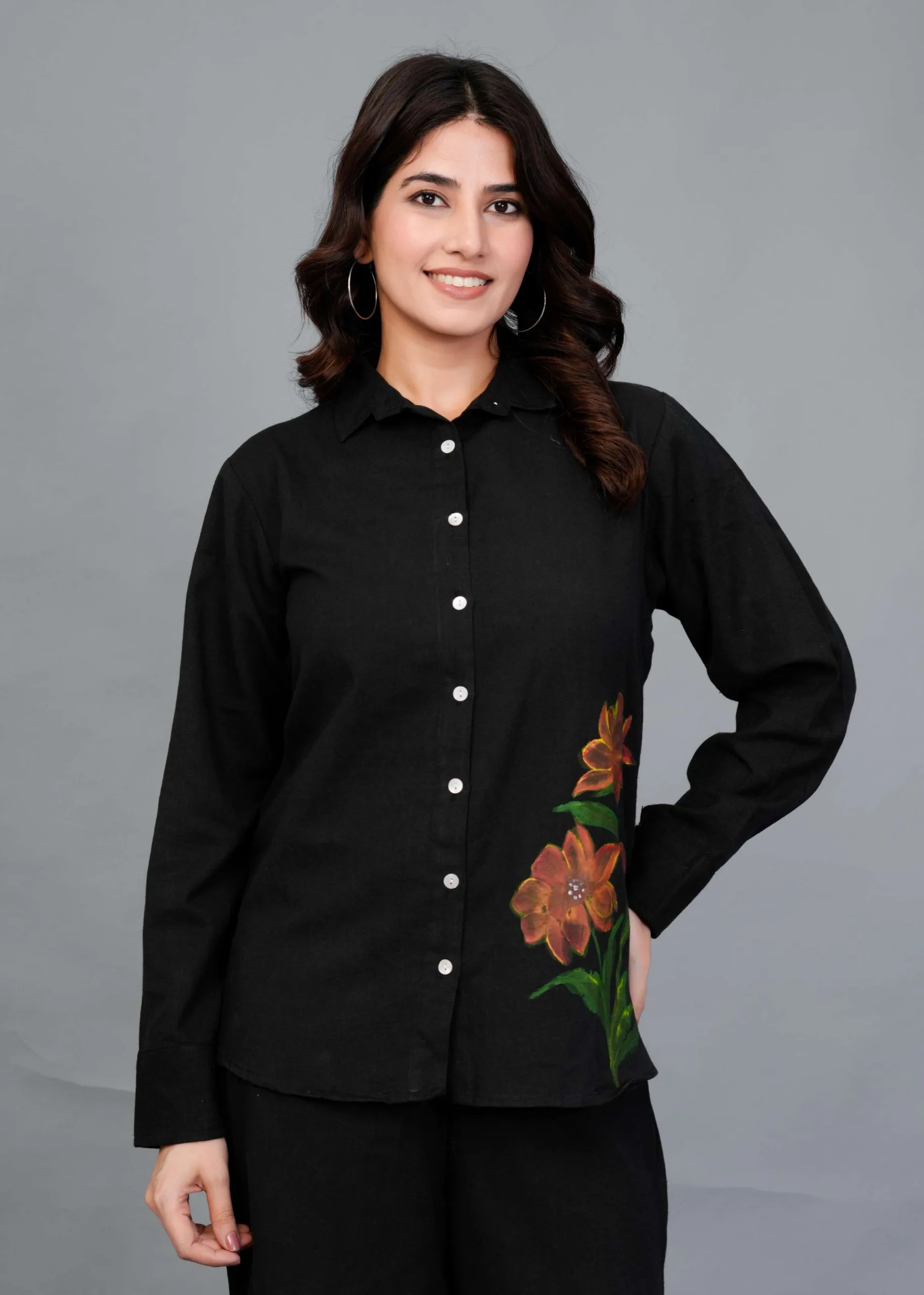 This is a black co-ord set featuring a button-down shirt and wide-legged trousers. The highlight of this outfit is its hand-painted floral design — large, detailed blooms in warm tones of orange, rust, and yellow with green leaves, adding an artistic pop of color to the minimal black base. The shirt has a classic collar and full sleeves, while the pants have a relaxed, flowy silhouette, making it both stylish and comfortable. Perfect for casual brunches, art events, or statement everyday wear.