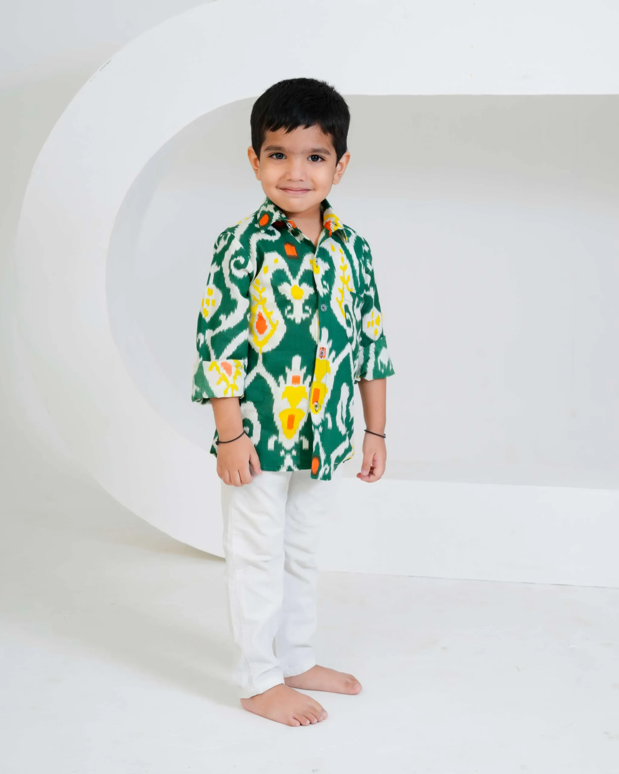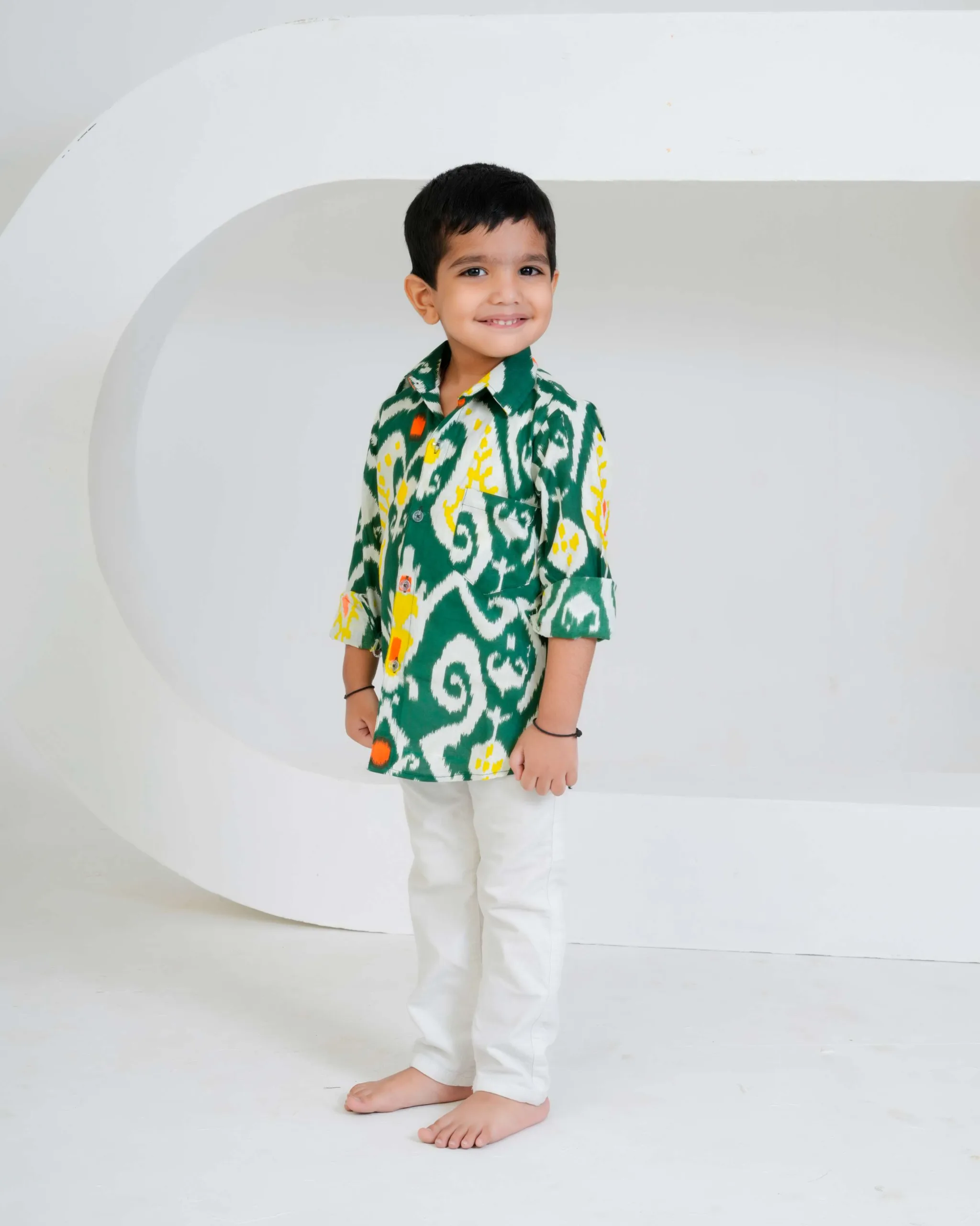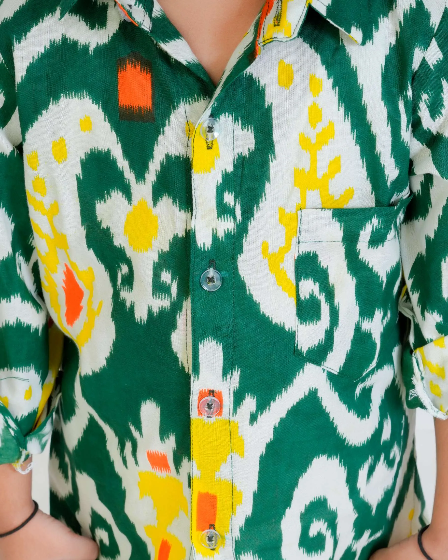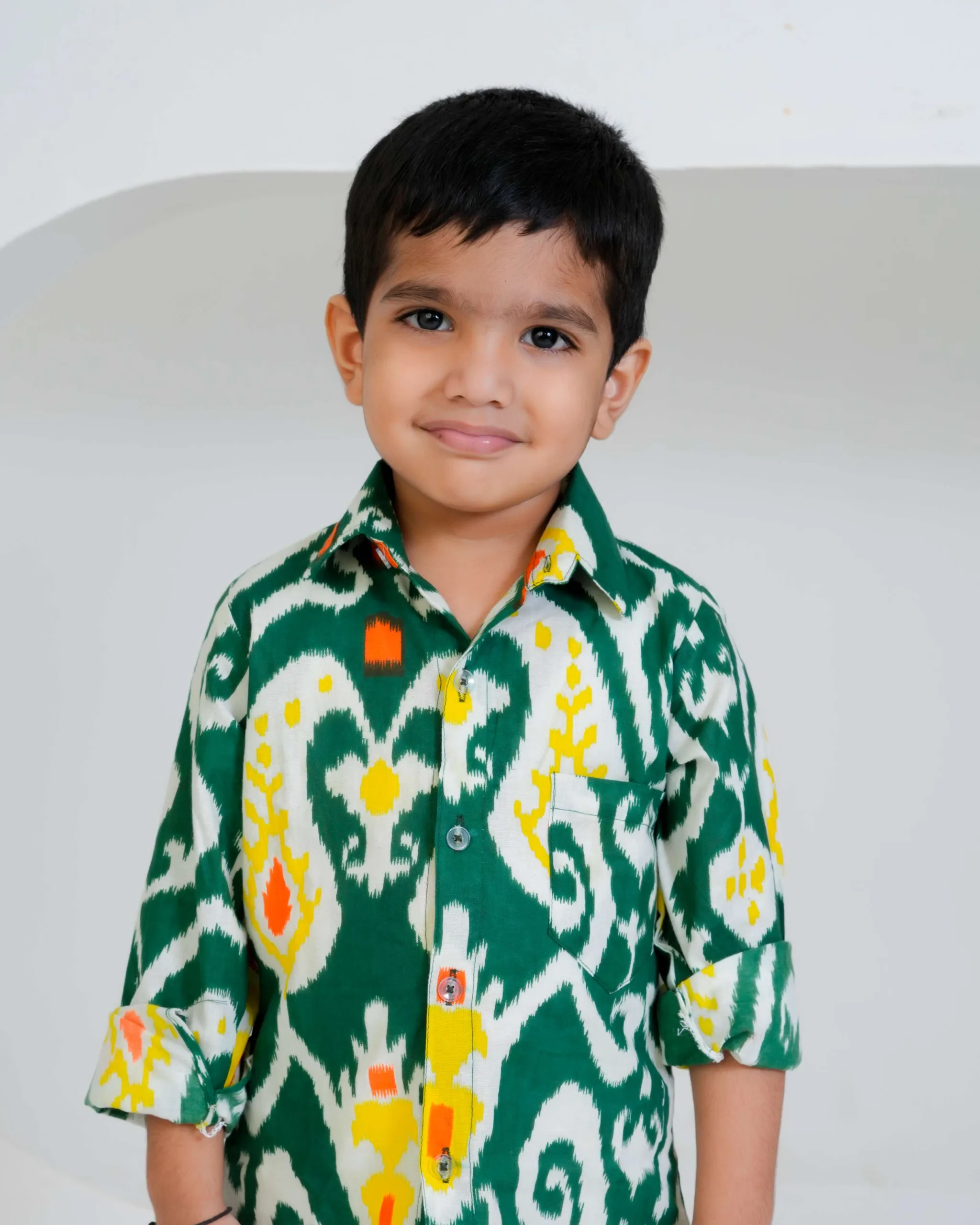 This green Ikat printed boys’ shirt is a vibrant fusion of tradition and style. Crafted in soft cotton, it features a striking handwoven-inspired Ikat pattern in shades of white, yellow, and orange. The full sleeves, collared neckline, and button-down front give it a classic yet playful appeal — perfect for festive occasions or casual outings. The breathable cotton fabric ensures all-day comfort for your little one.