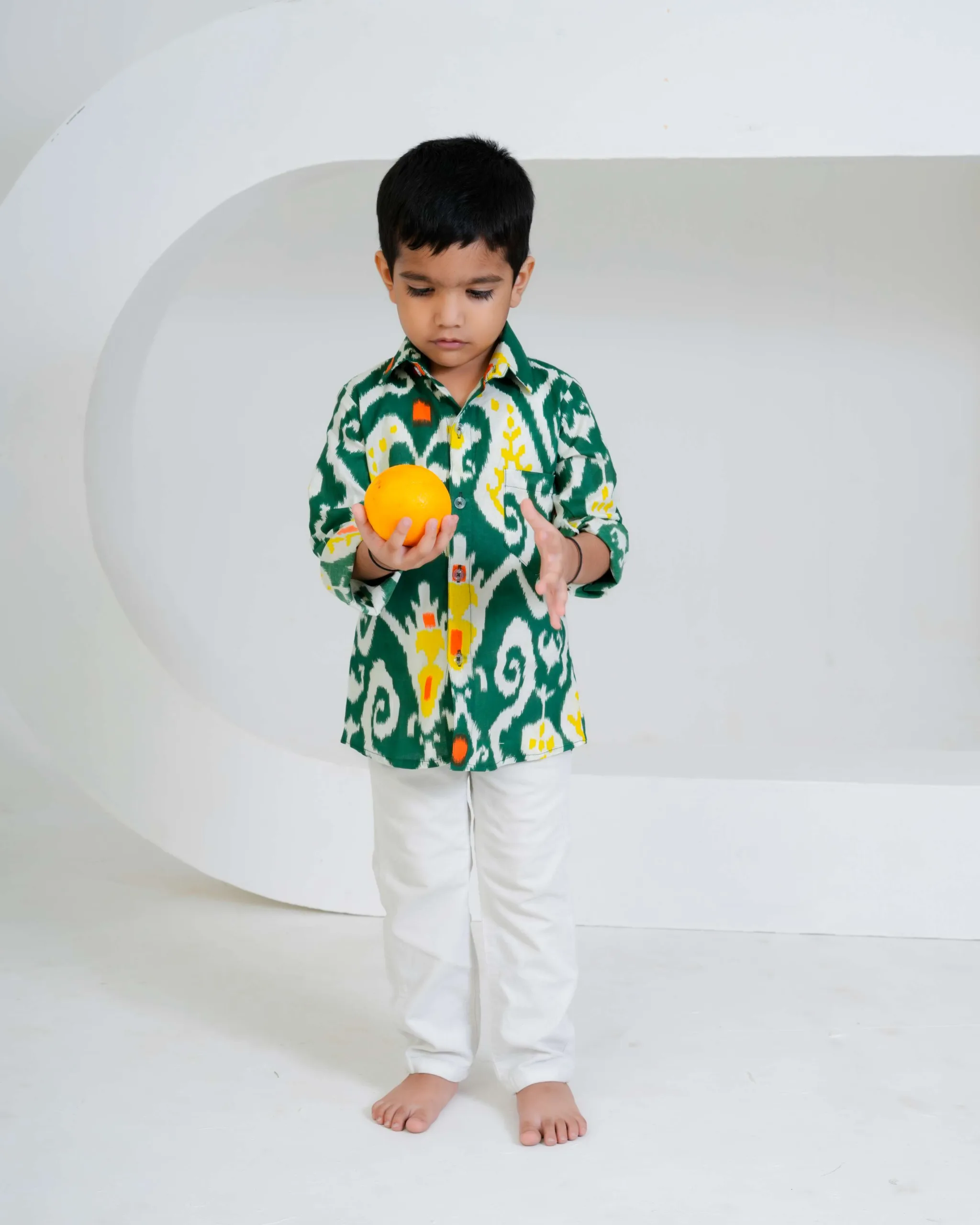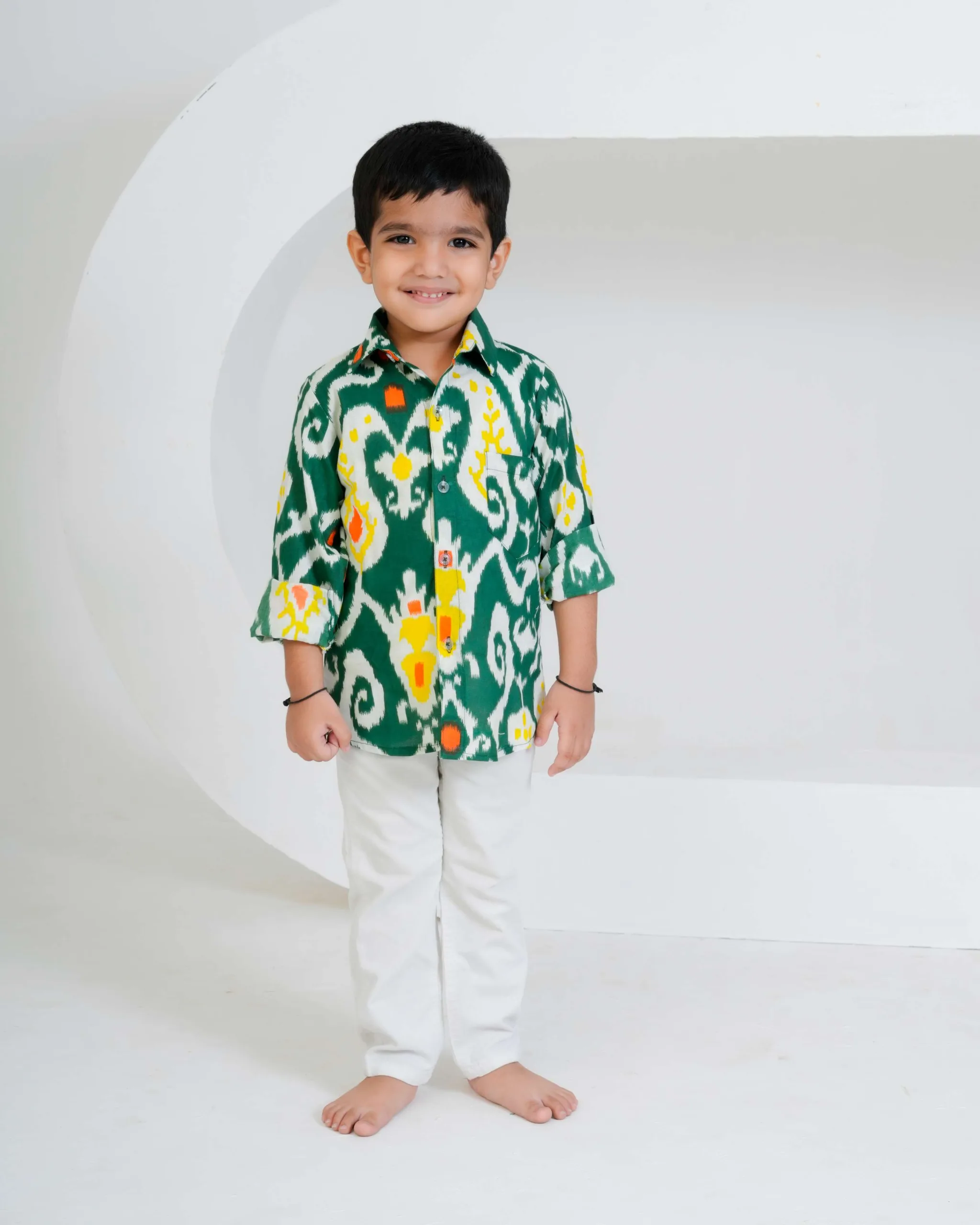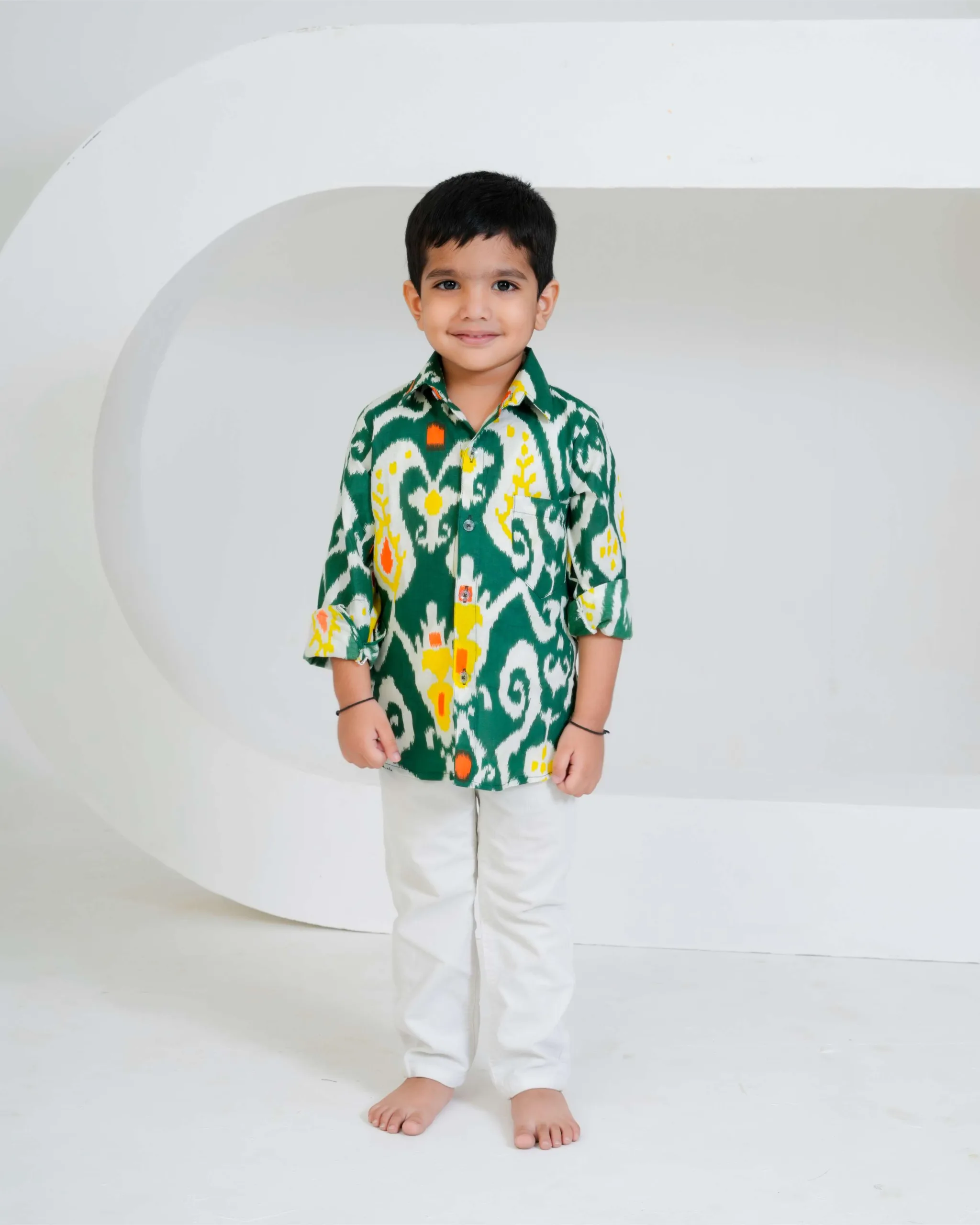 This green Ikat printed boys’ shirt is a vibrant fusion of tradition and style. Crafted in soft cotton, it features a striking handwoven-inspired Ikat pattern in shades of white, yellow, and orange. The full sleeves, collared neckline, and button-down front give it a classic yet playful appeal — perfect for festive occasions or casual outings. The breathable cotton fabric ensures all-day comfort for your little one.