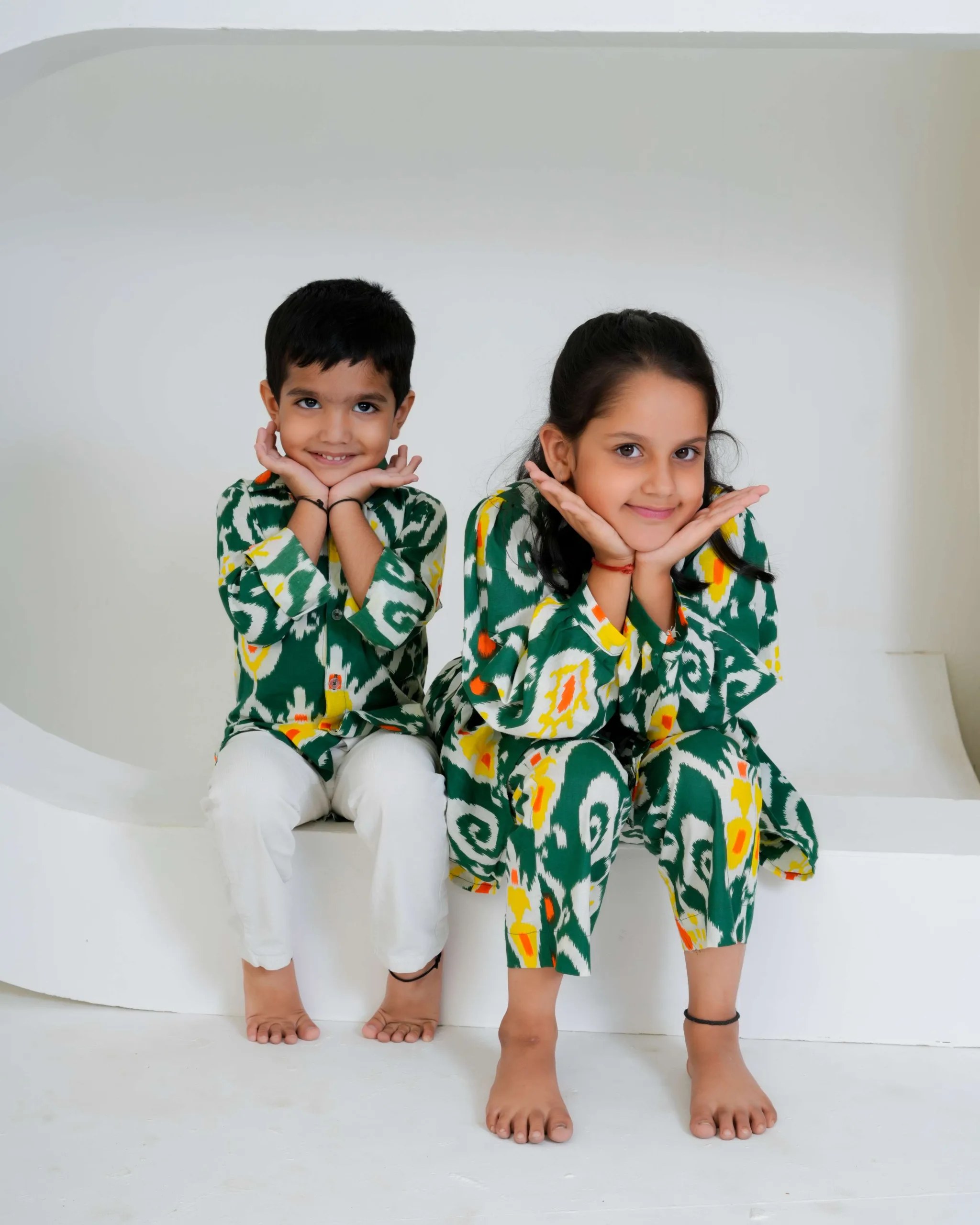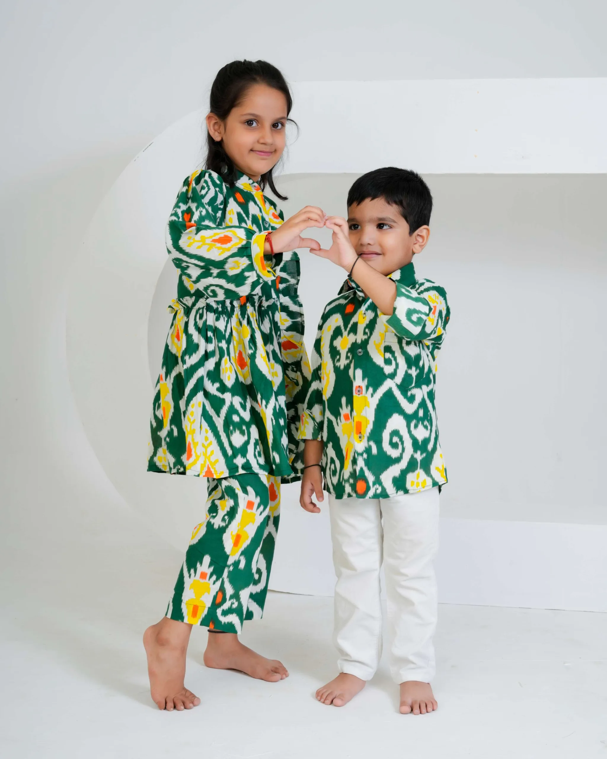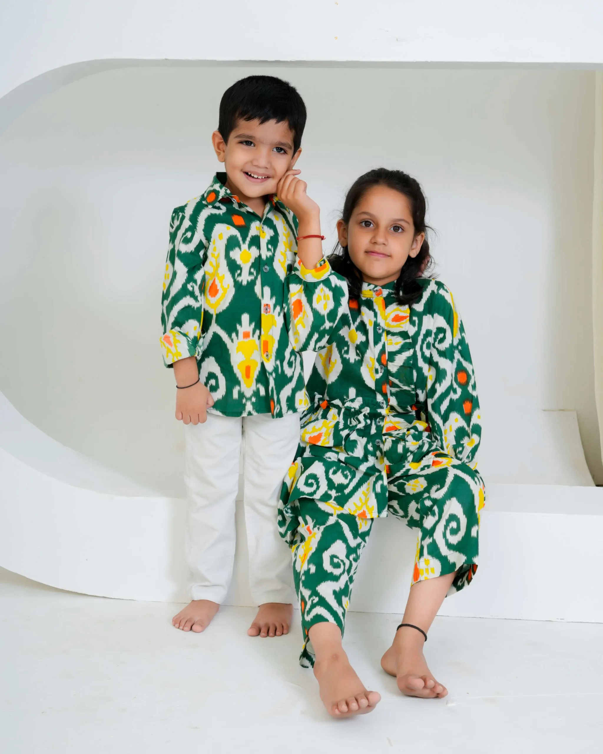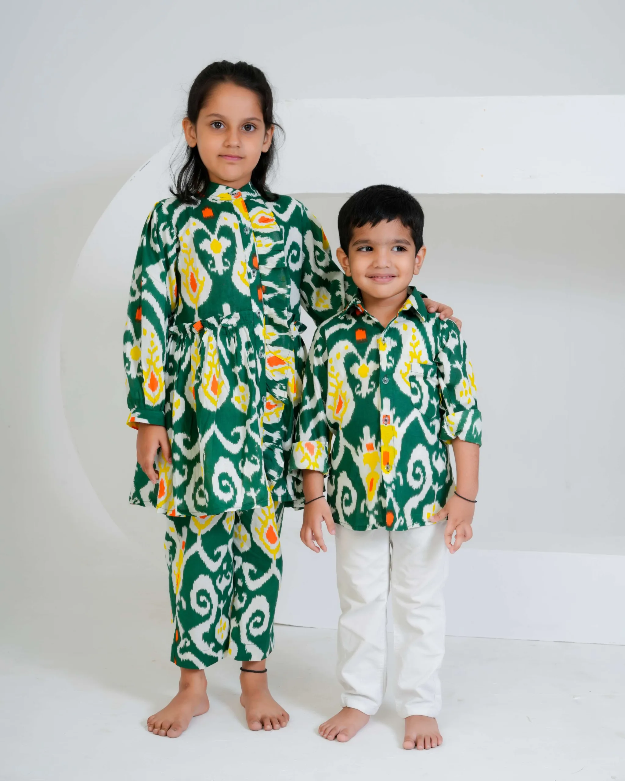 This green Ikat printed boys’ shirt is a vibrant fusion of tradition and style. Crafted in soft cotton, it features a striking handwoven-inspired Ikat pattern in shades of white, yellow, and orange. The full sleeves, collared neckline, and button-down front give it a classic yet playful appeal — perfect for festive occasions or casual outings. The breathable cotton fabric ensures all-day comfort for your little one.