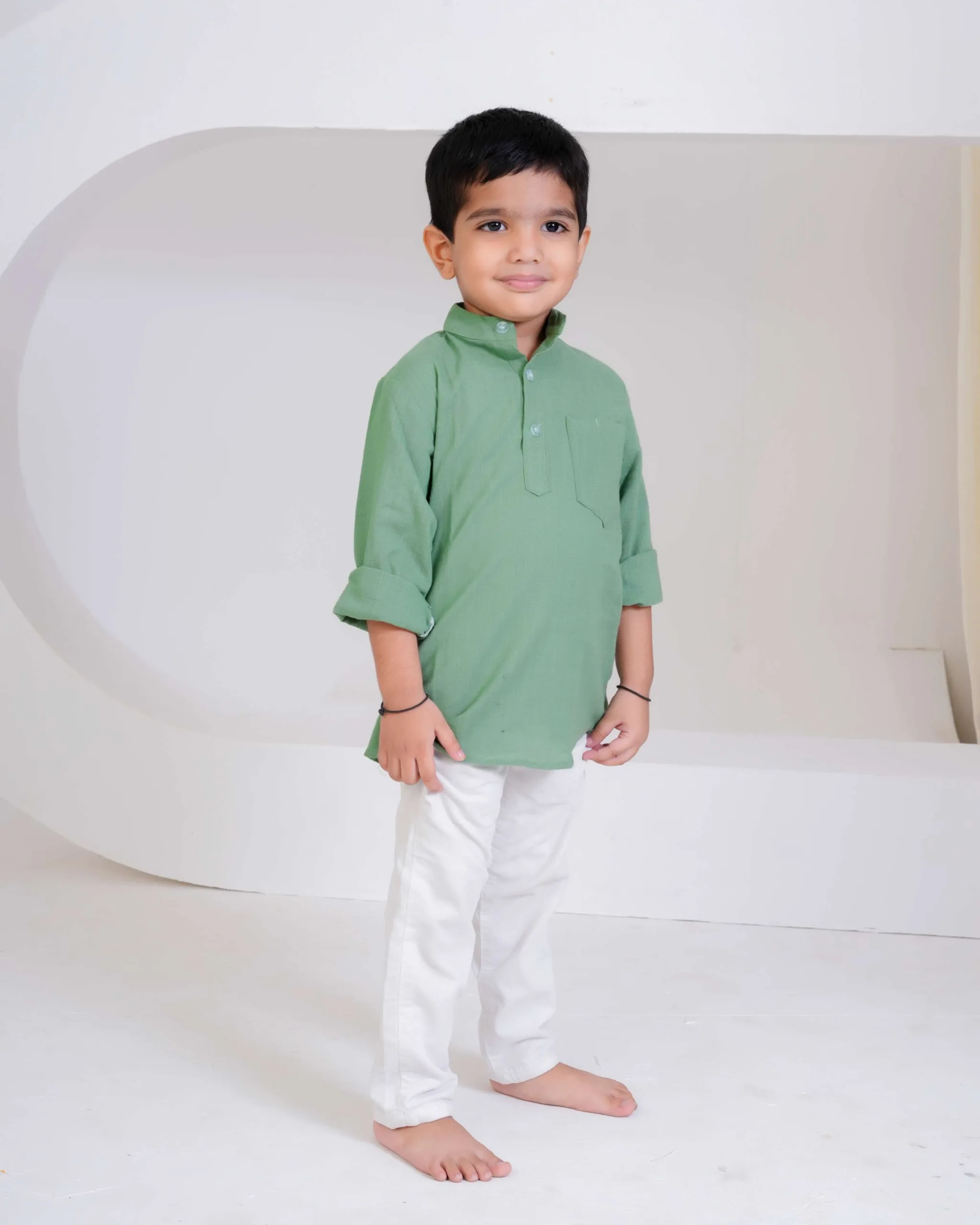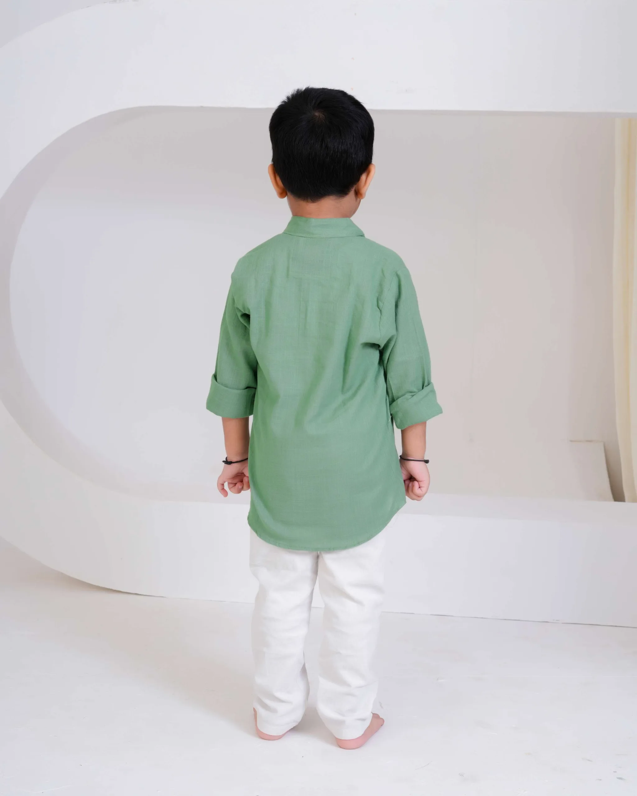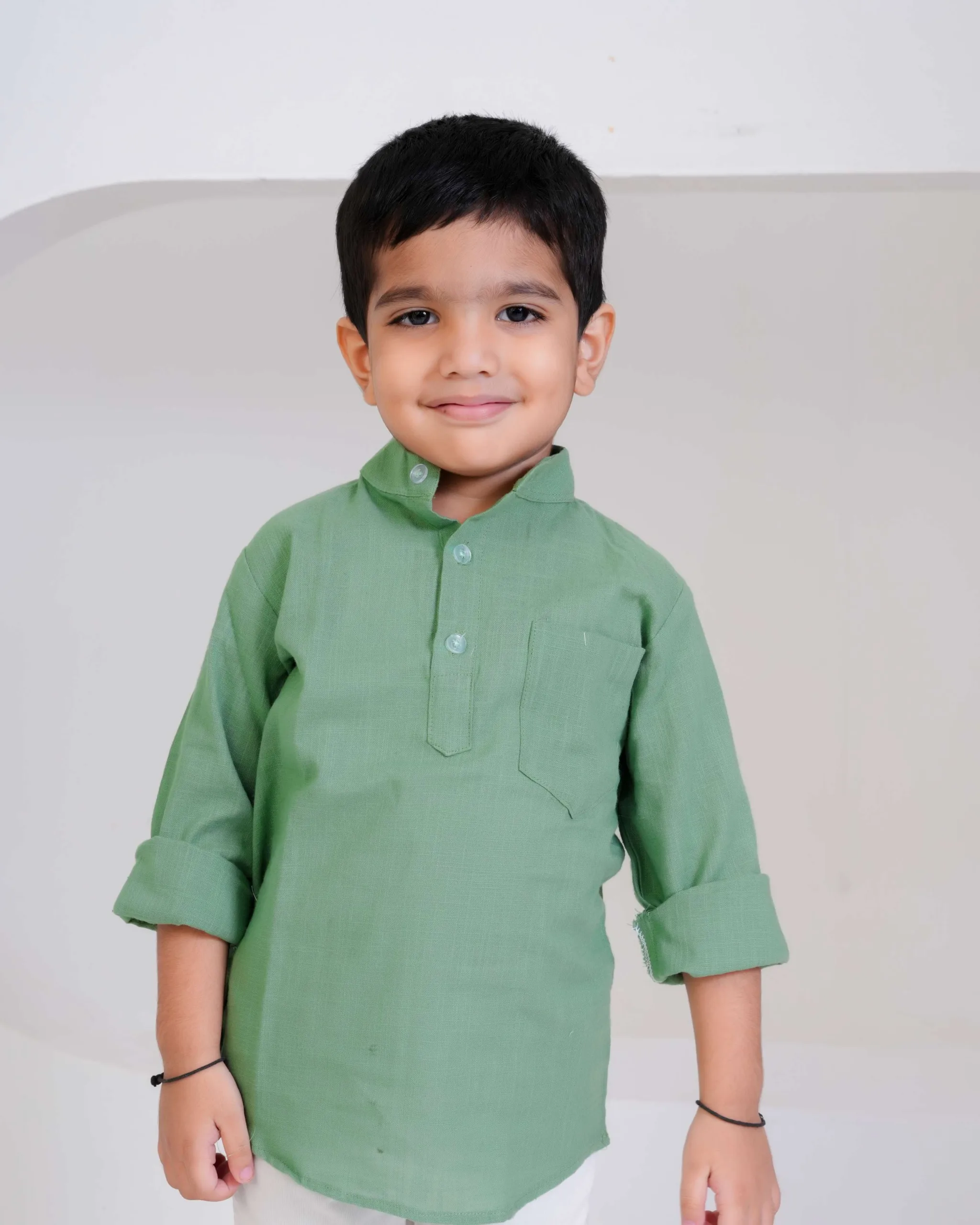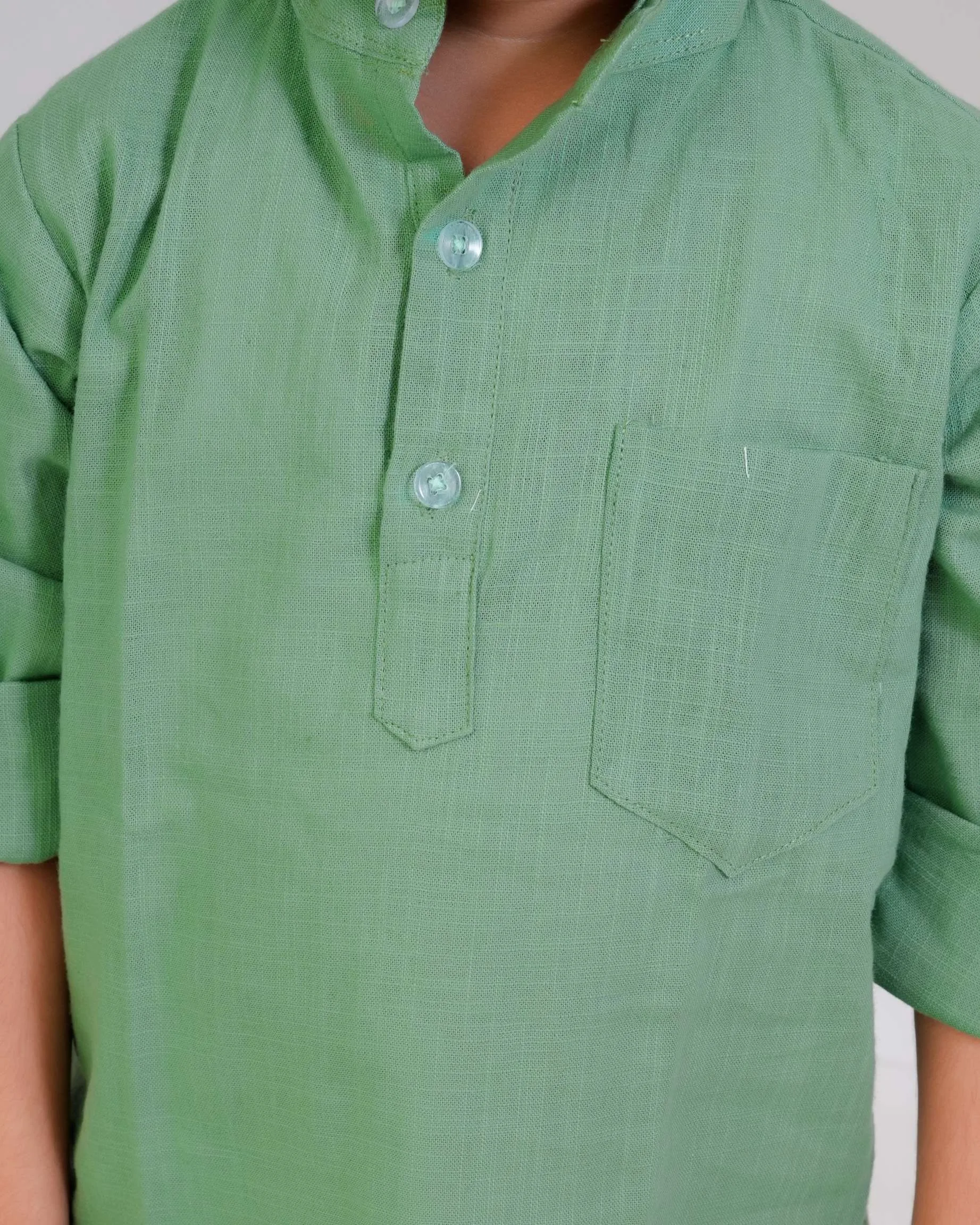 Keep it simple and stylish with this pastel green kurta shirt — crafted from soft cotton for everyday comfort. Its smart mandarin collar and rolled sleeves make it the perfect mix of tradition and trend for your little gentleman.