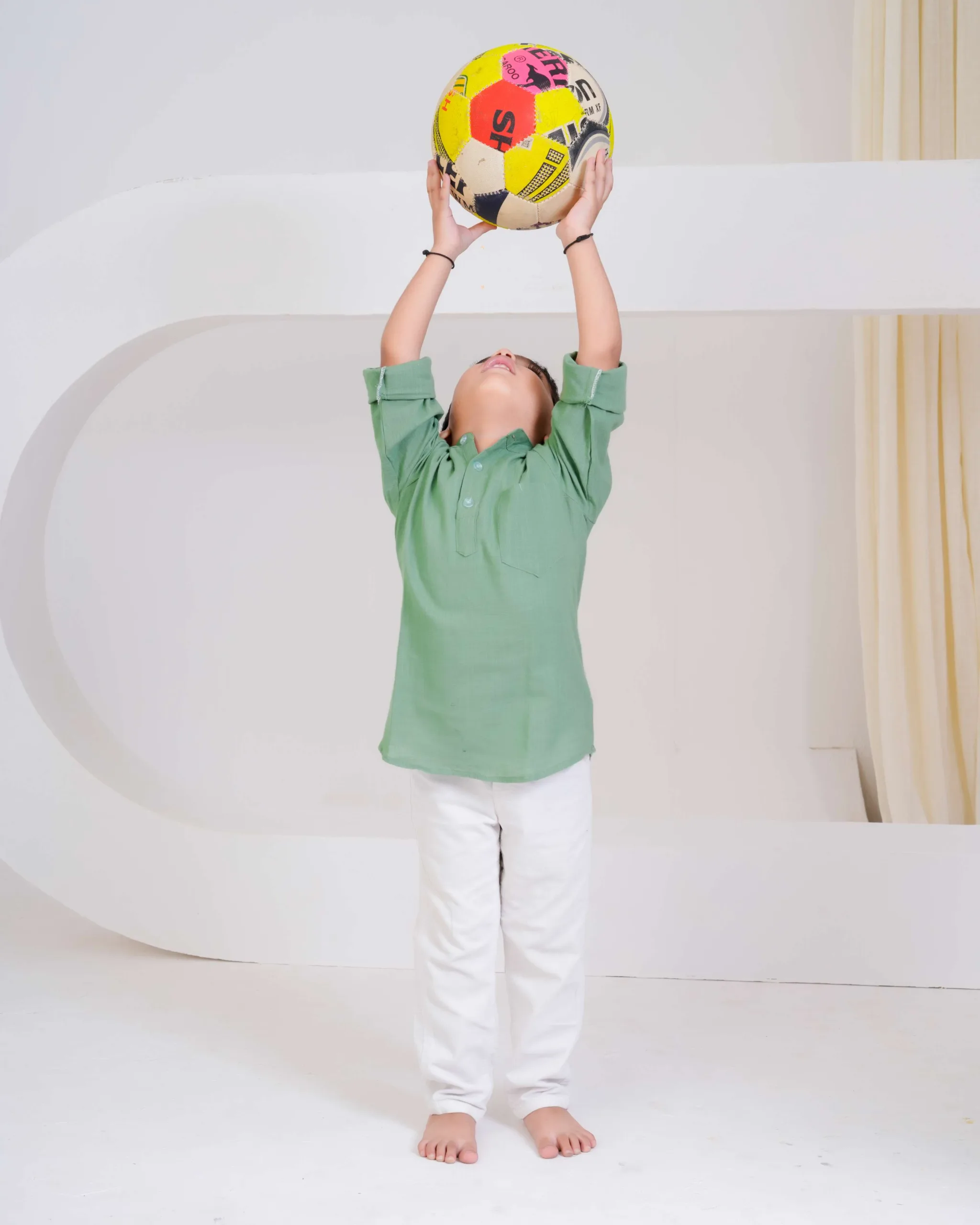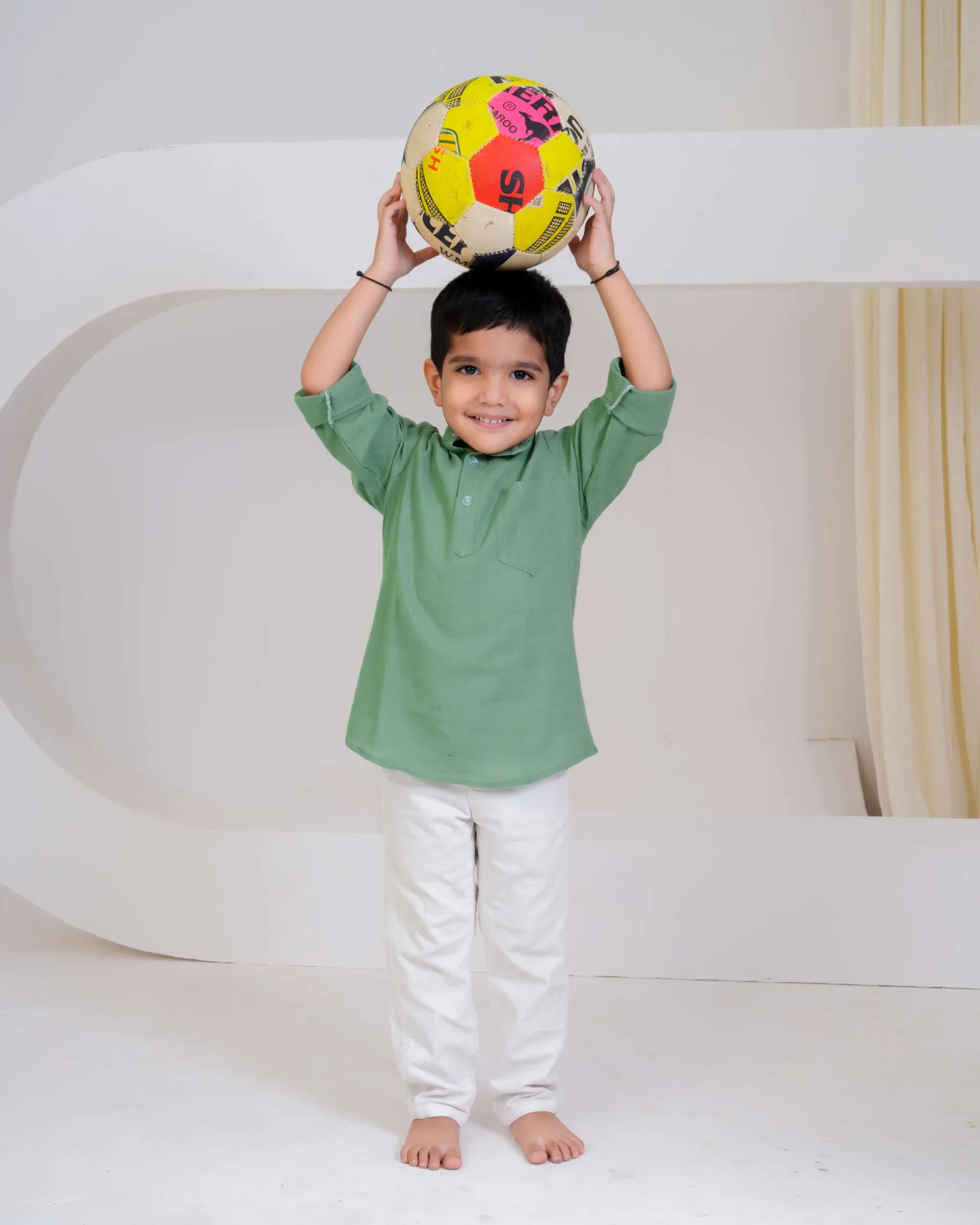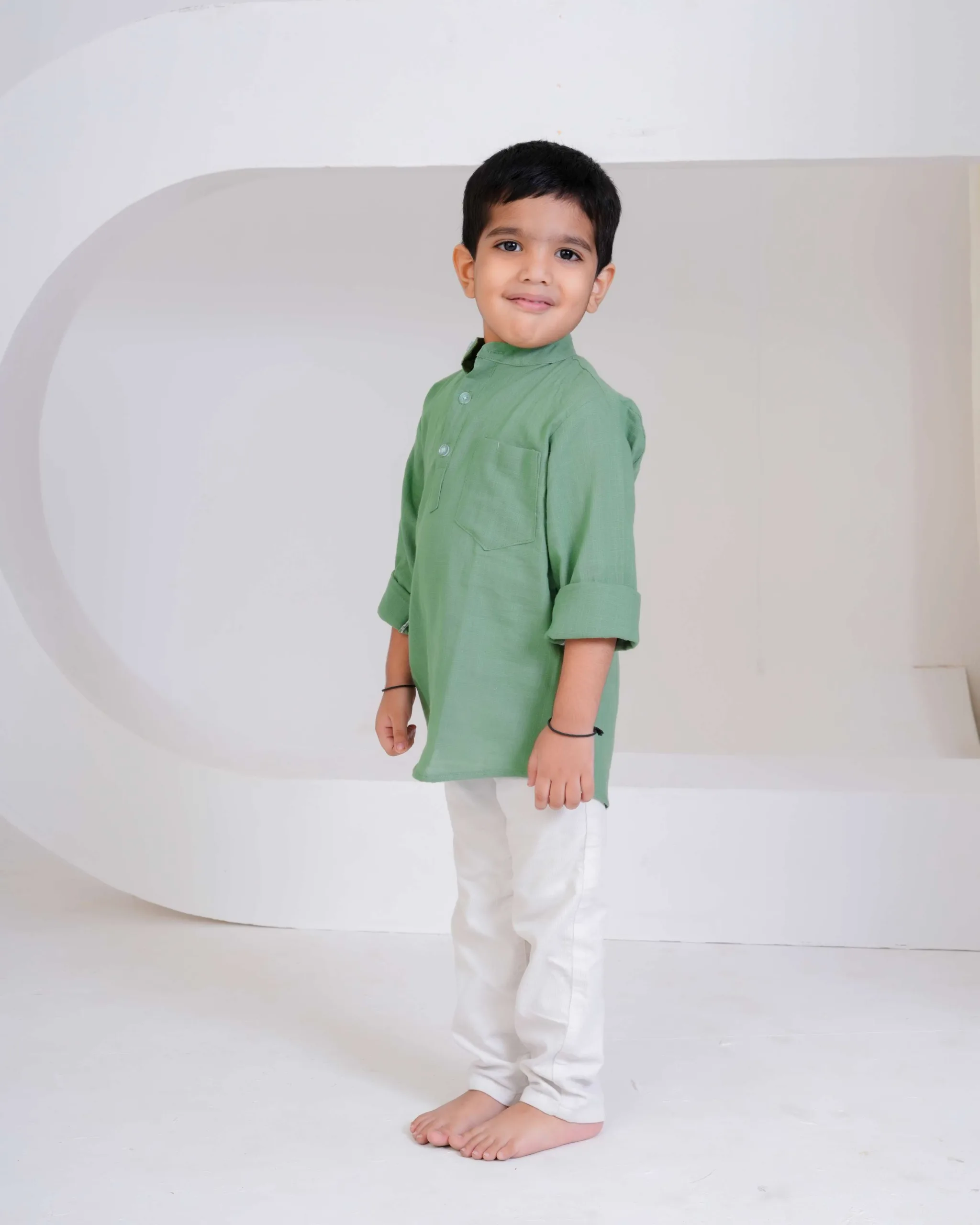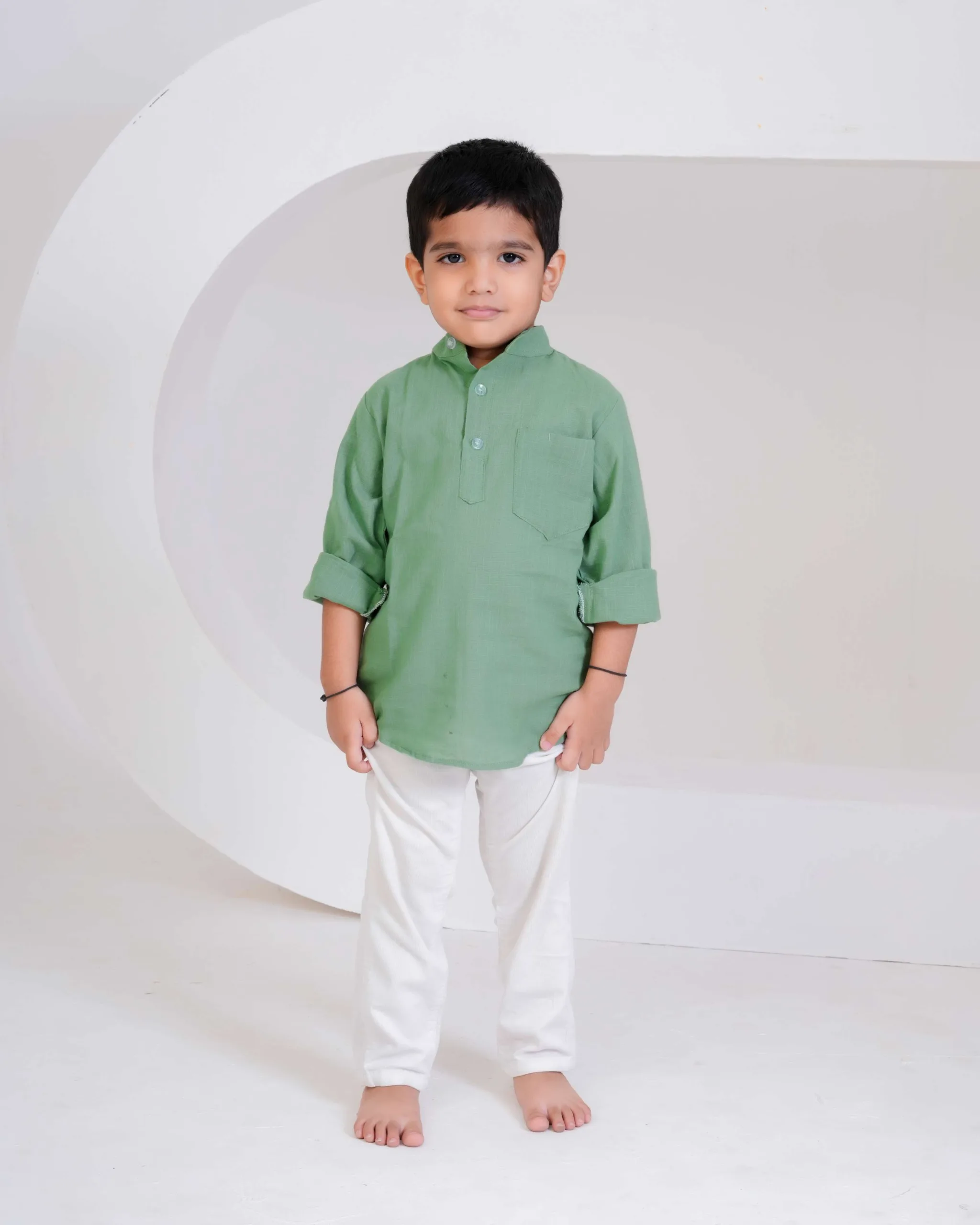 Keep it simple and stylish with this pastel green kurta shirt — crafted from soft cotton for everyday comfort. Its smart mandarin collar and rolled sleeves make it the perfect mix of tradition and trend for your little gentleman.