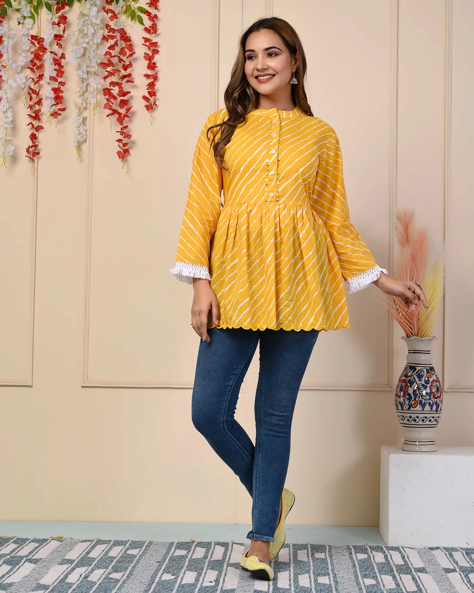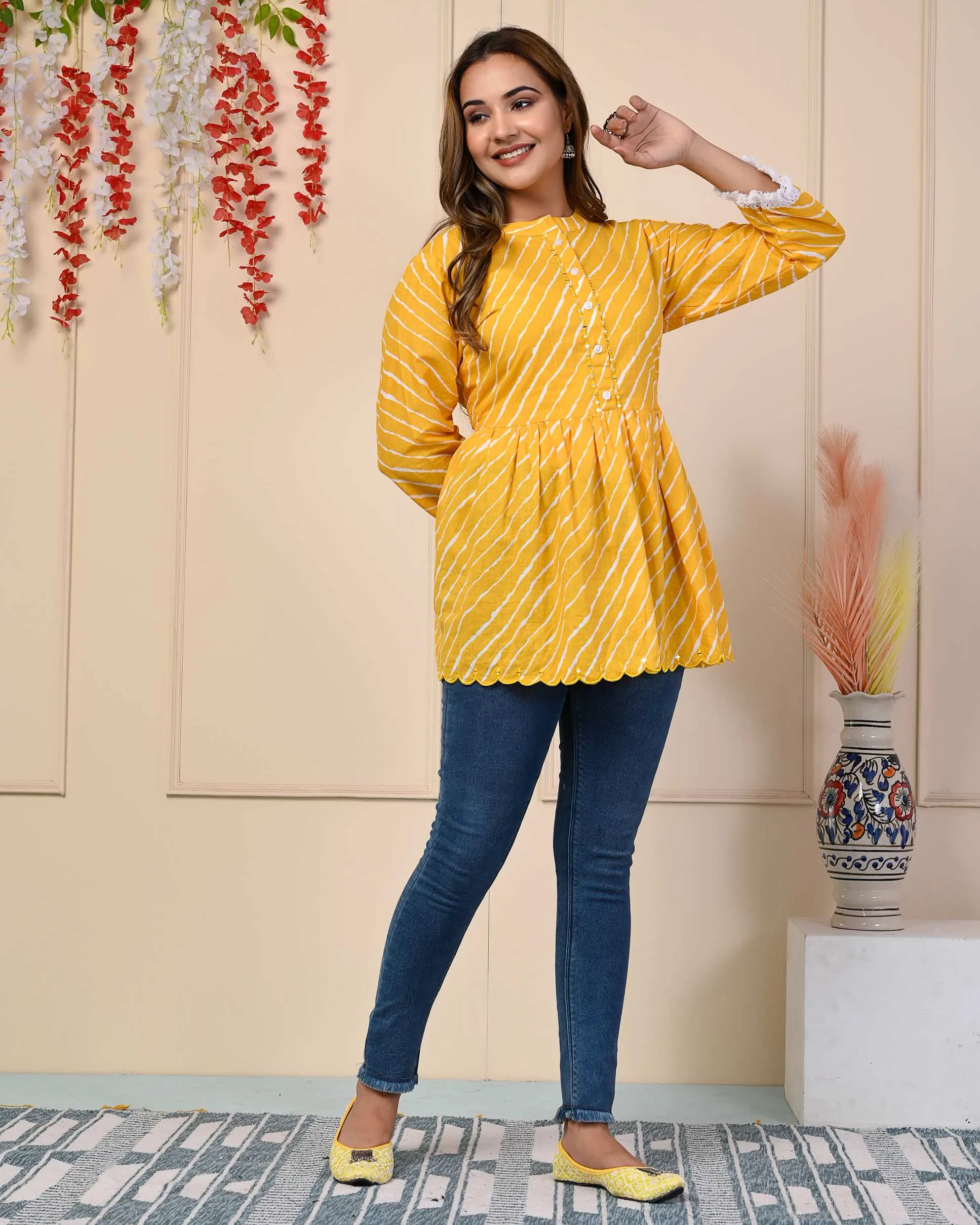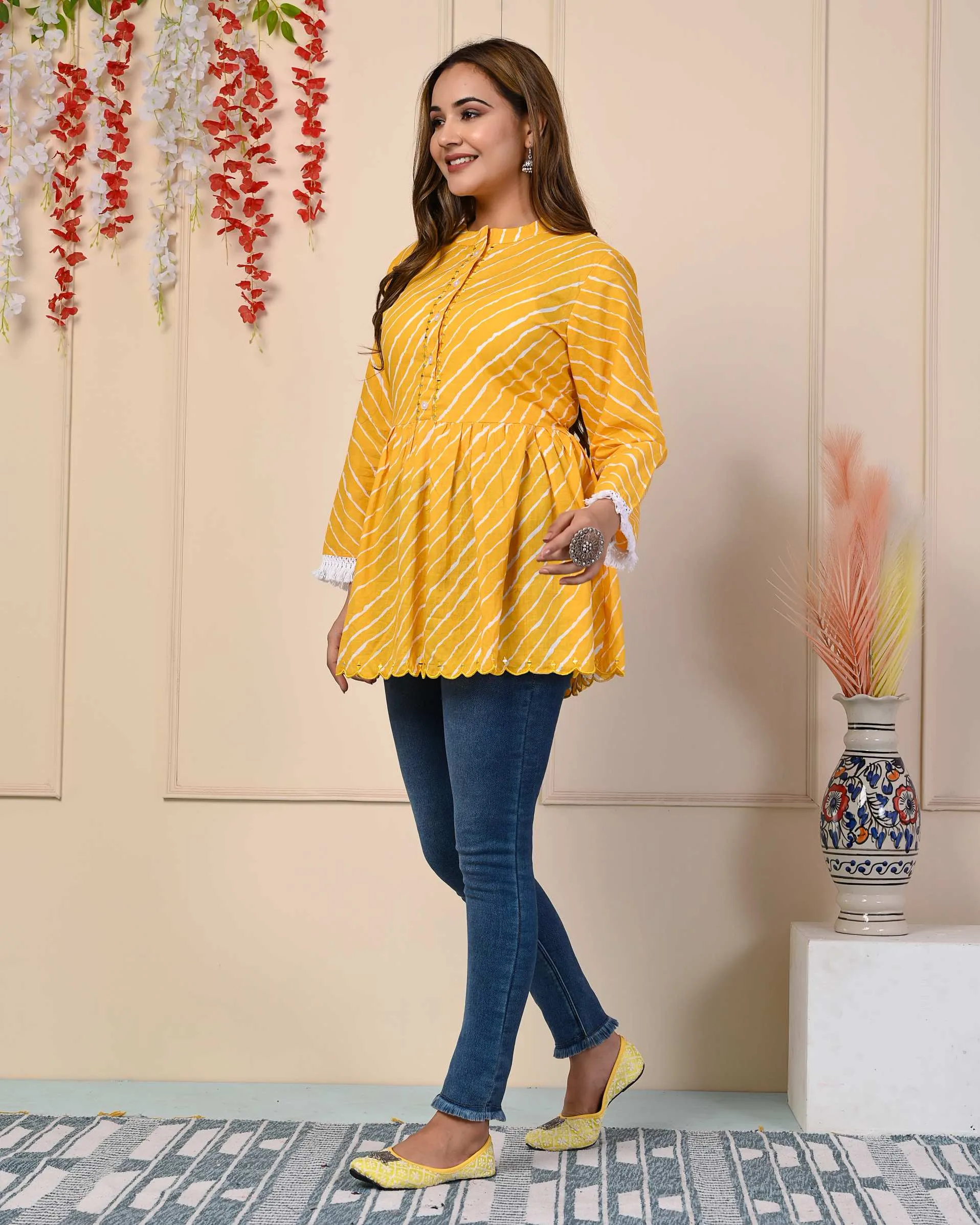 “Indulge in Style with Yellow Stripe Print Cotton Flared Top, It Has Stripe Printed All Over and Regular Sleeves, it has three-fourth sleeves. Best Suited for Formal and Informal Gatherings, You Can Wear It with Cotton Pants, Denims, or Leggings.