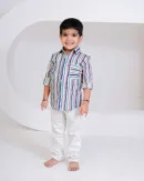 This adorable striped cotton shirt for boys is a perfect mix of color and comfort. Designed with multi-colored hand-drawn style stripes in soft hues of blue, maroon, and beige, it brings a fun and lively vibe to any look. The shirt features a classic collar, front button placket, and a matching chest pocket for a neat, smart finish. Crafted from lightweight and breathable cotton, it ensures all-day ease — perfect for playdates, picnics, or casual outings.