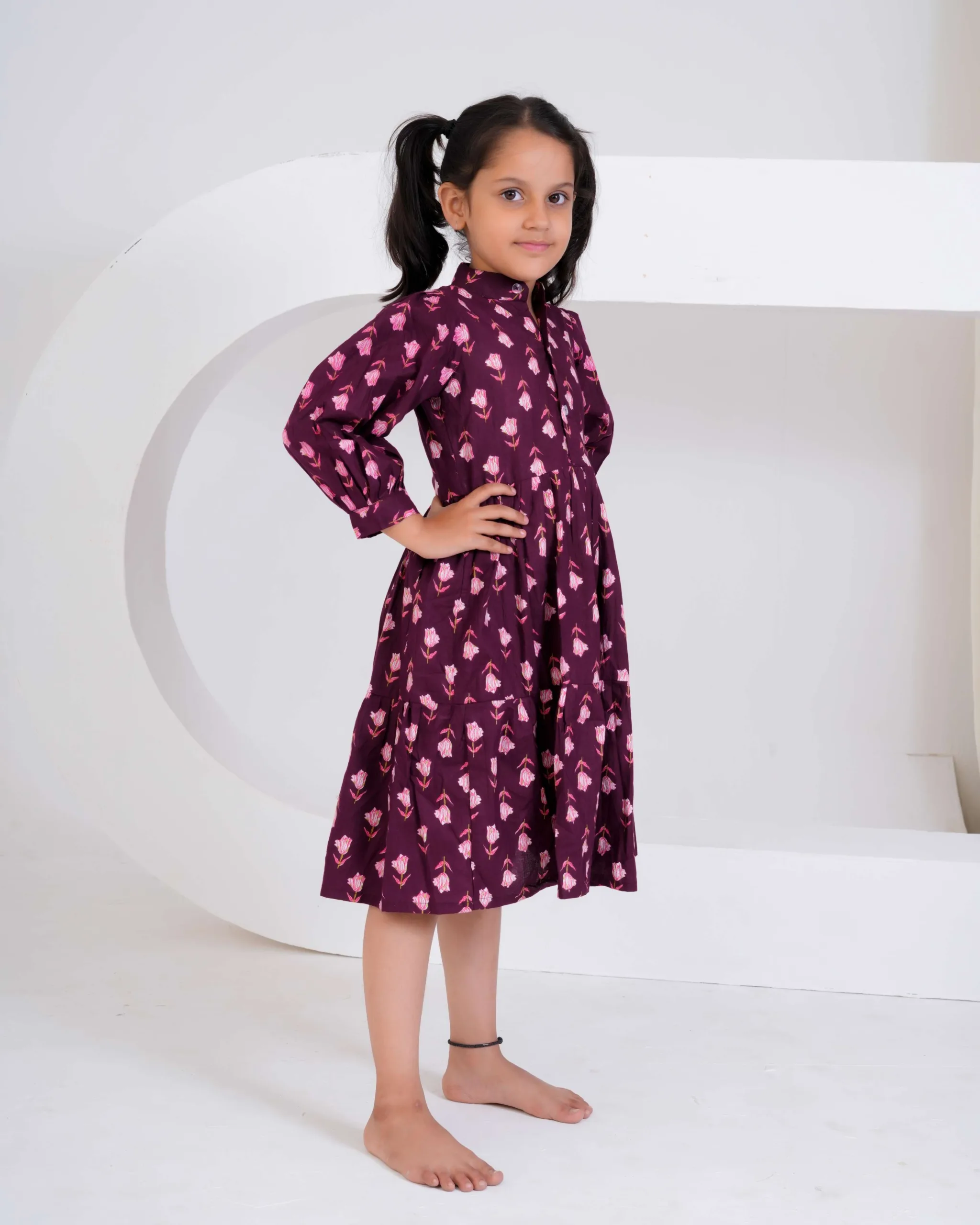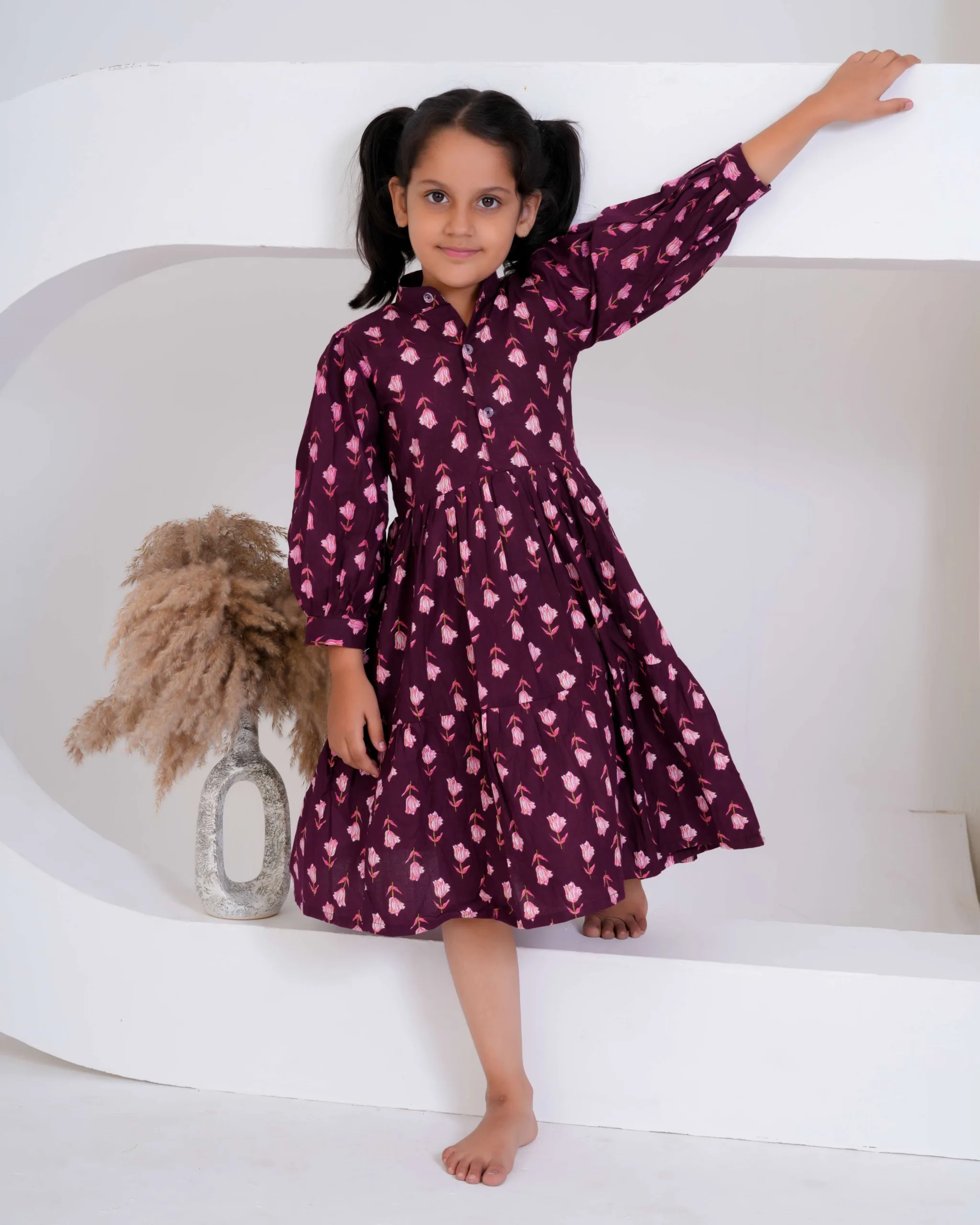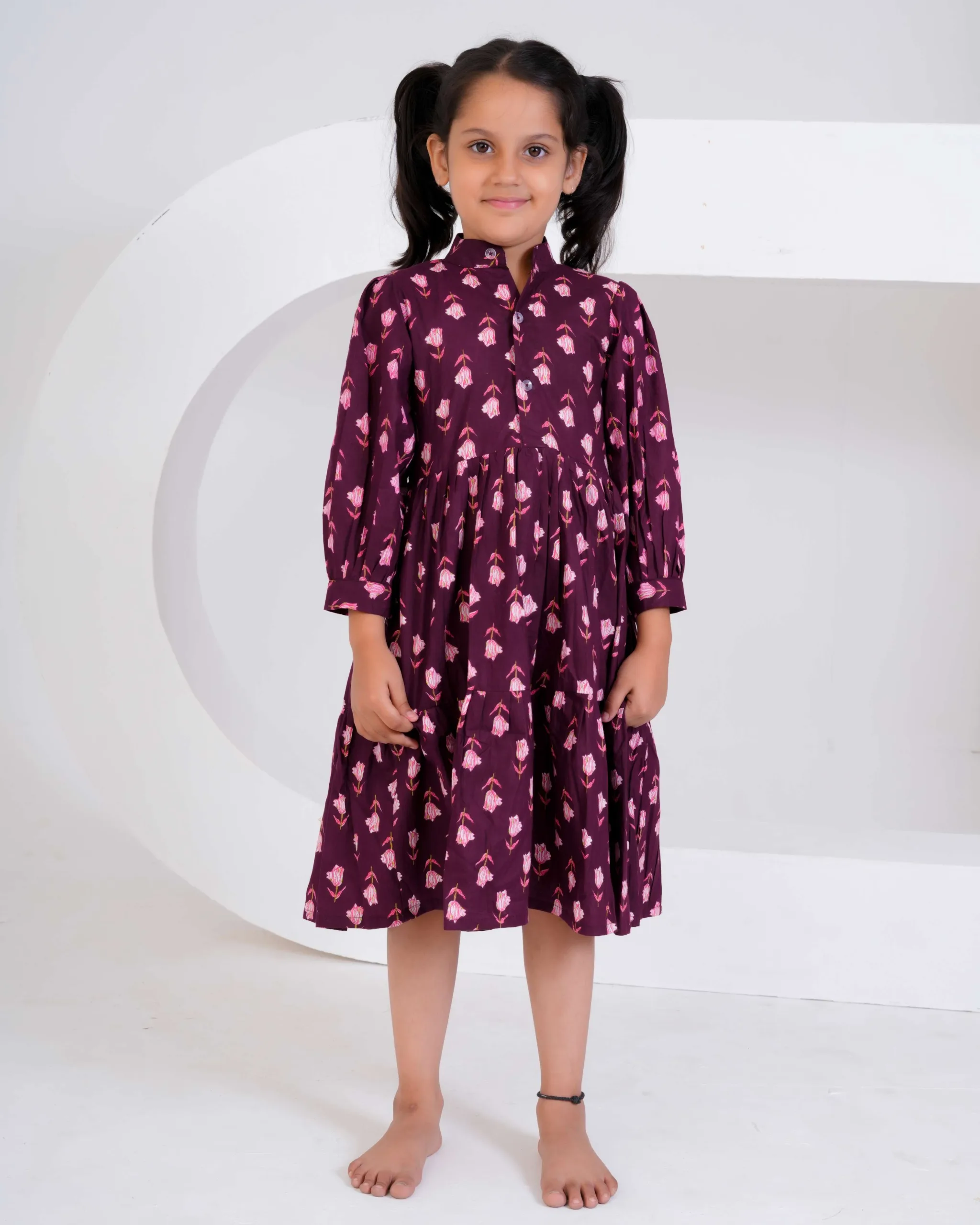 Graceful, comfy, and full of charm — this plum cotton dress is a delightful pick for your little one’s everyday elegance. Featuring a mandarin collar with a button-down front, it adds a hint of sophistication while keeping the look effortlessly cute. The tiered gathers create a flowy, twirl-worthy silhouette, perfect for playful moments. Adorned with delicate floral motifs in soft pink hues, this dress is crafted from lightweight, breathable cotton for all-day comfort. Ideal for family outings, festive gatherings, or casual celebrations, it brings together style and ease in the most adorable way.