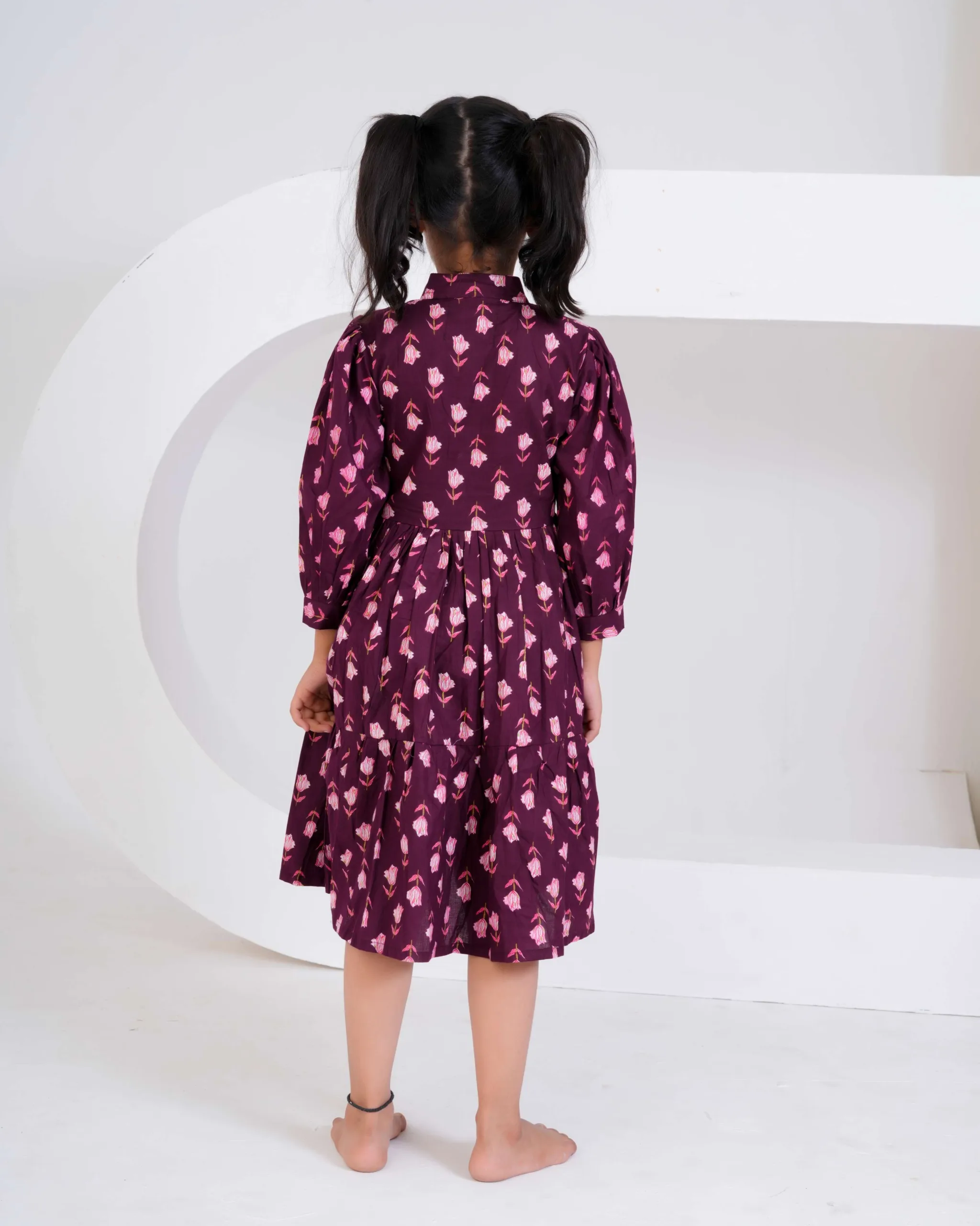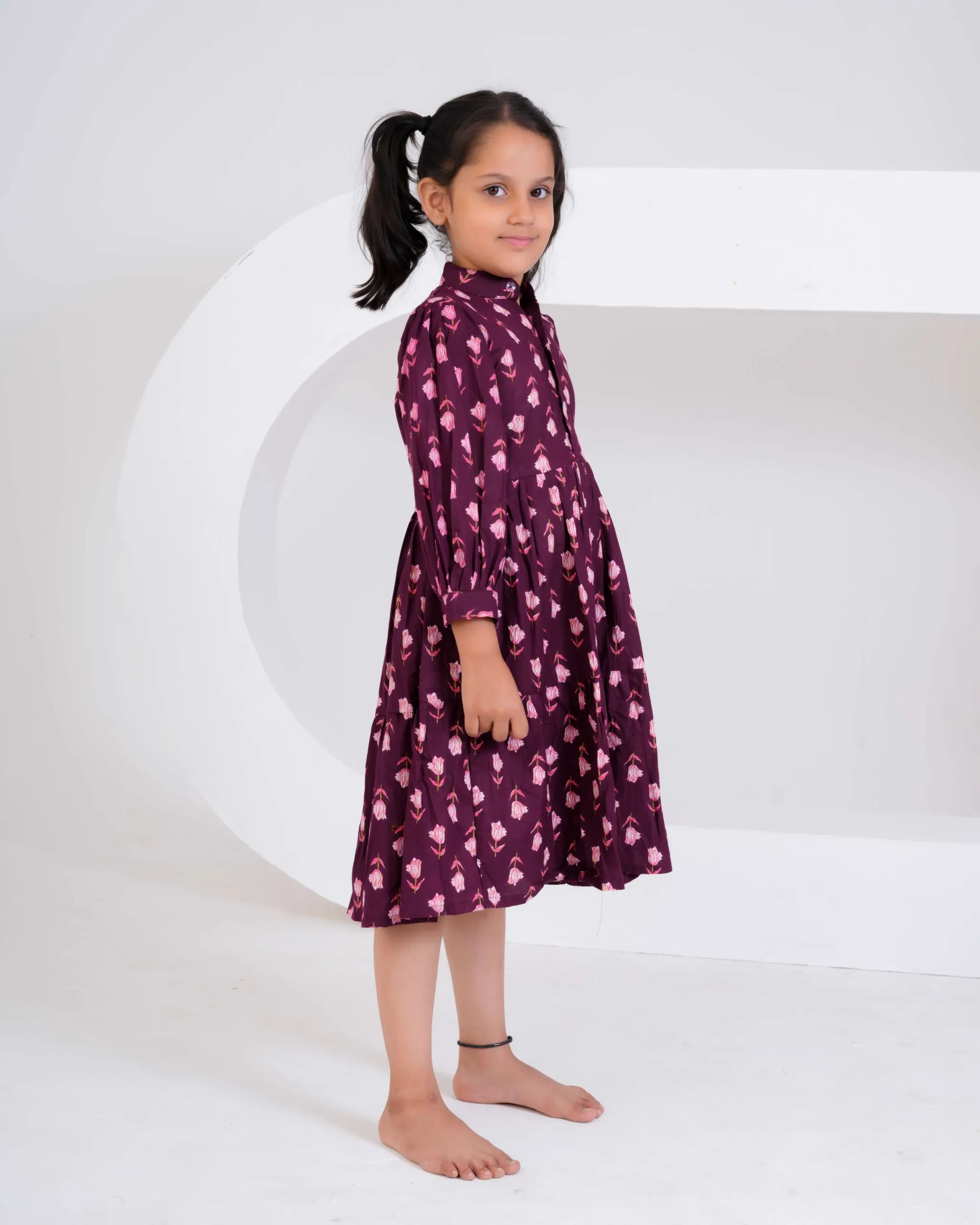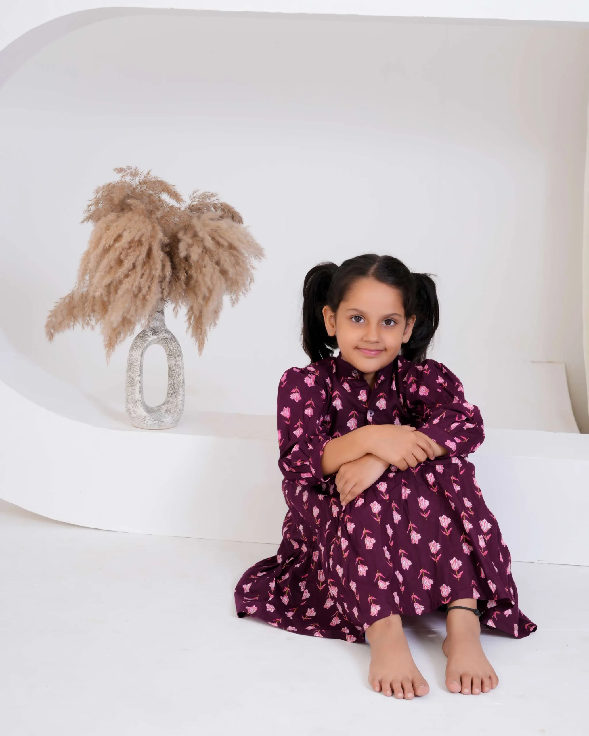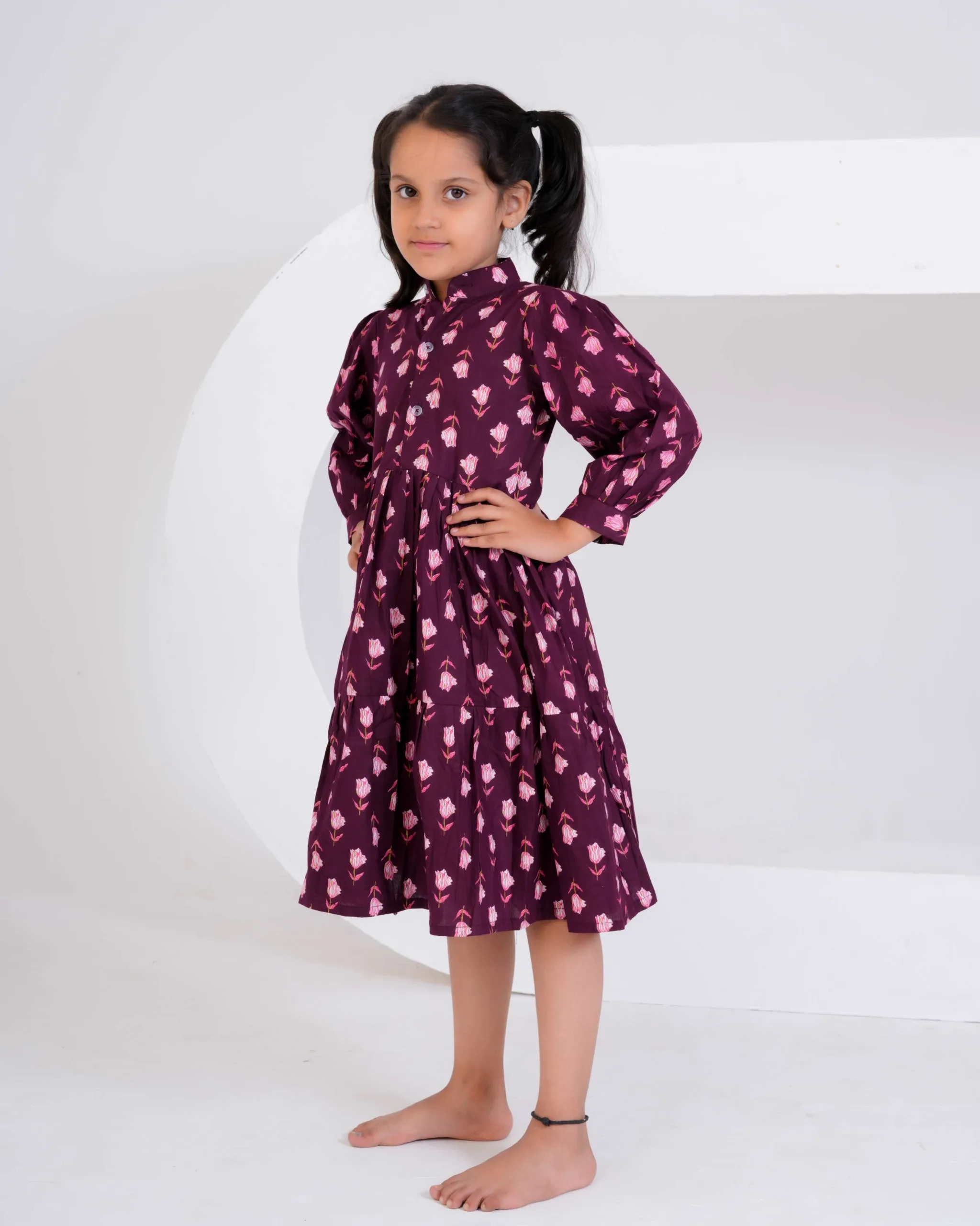 Graceful, comfy, and full of charm — this plum cotton dress is a delightful pick for your little one’s everyday elegance. Featuring a mandarin collar with a button-down front, it adds a hint of sophistication while keeping the look effortlessly cute. The tiered gathers create a flowy, twirl-worthy silhouette, perfect for playful moments. Adorned with delicate floral motifs in soft pink hues, this dress is crafted from lightweight, breathable cotton for all-day comfort. Ideal for family outings, festive gatherings, or casual celebrations, it brings together style and ease in the most adorable way.