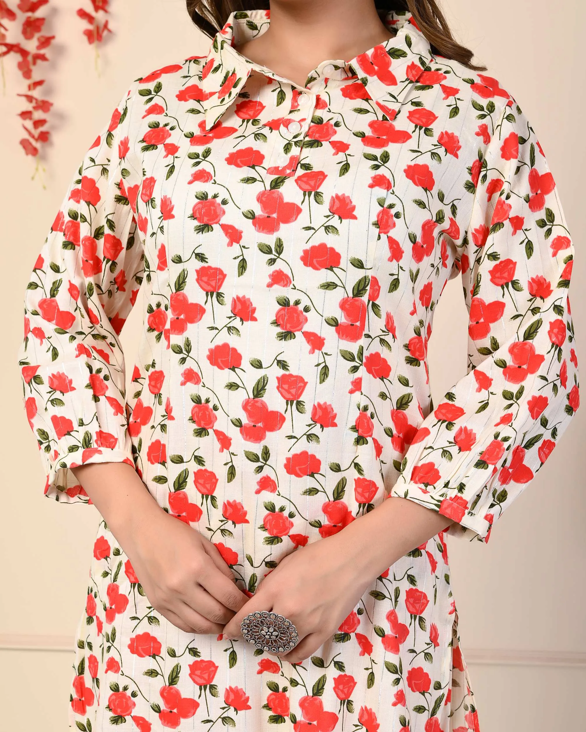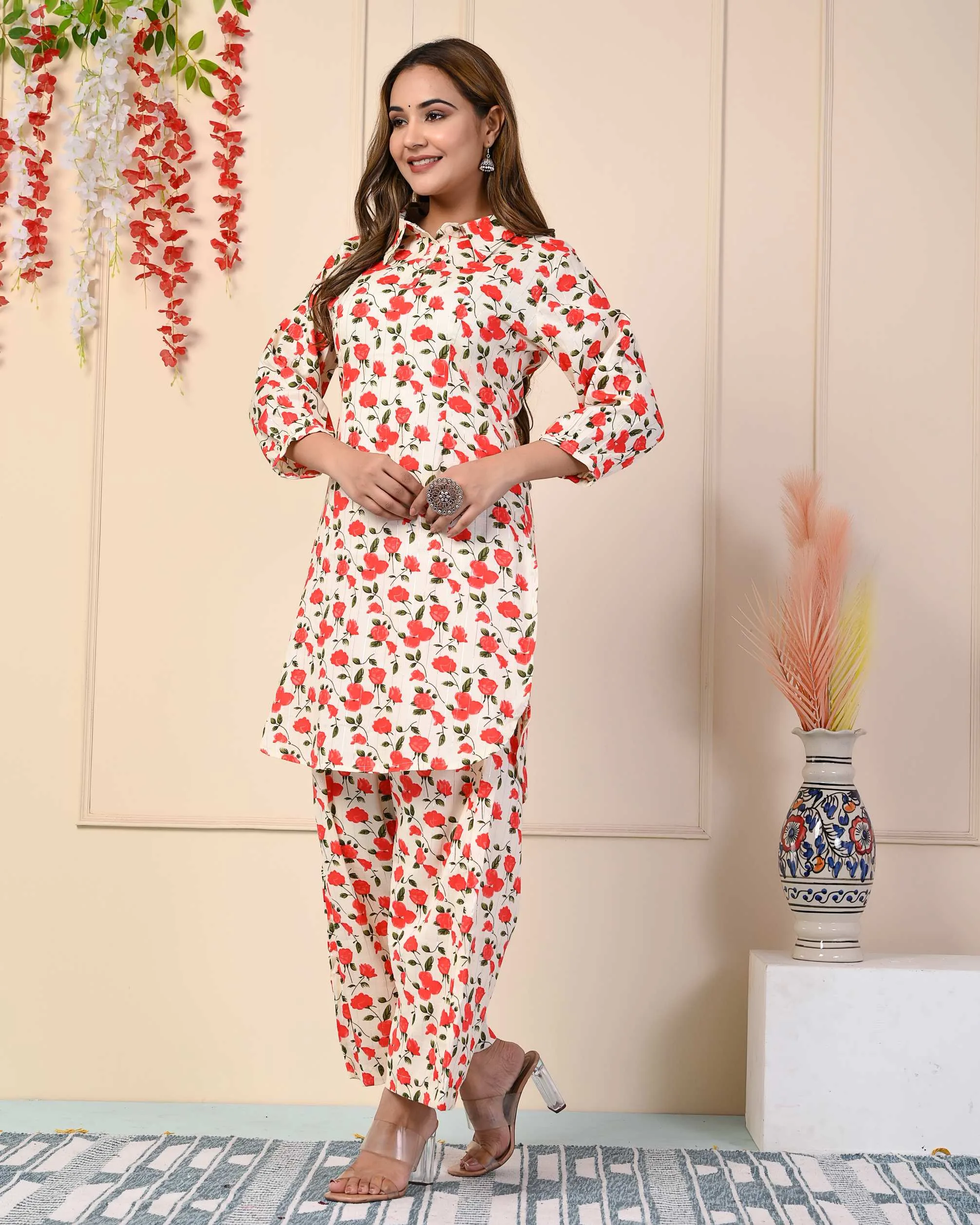 This co-ord set consists of a Kurta and trousers, cotton flex floral Kurta, has shirt collar, Long sleeves and button closure, trousers, has an elasticated waistband with slip-on closure Co-ord-Set for Formal and Informal Gatherings.