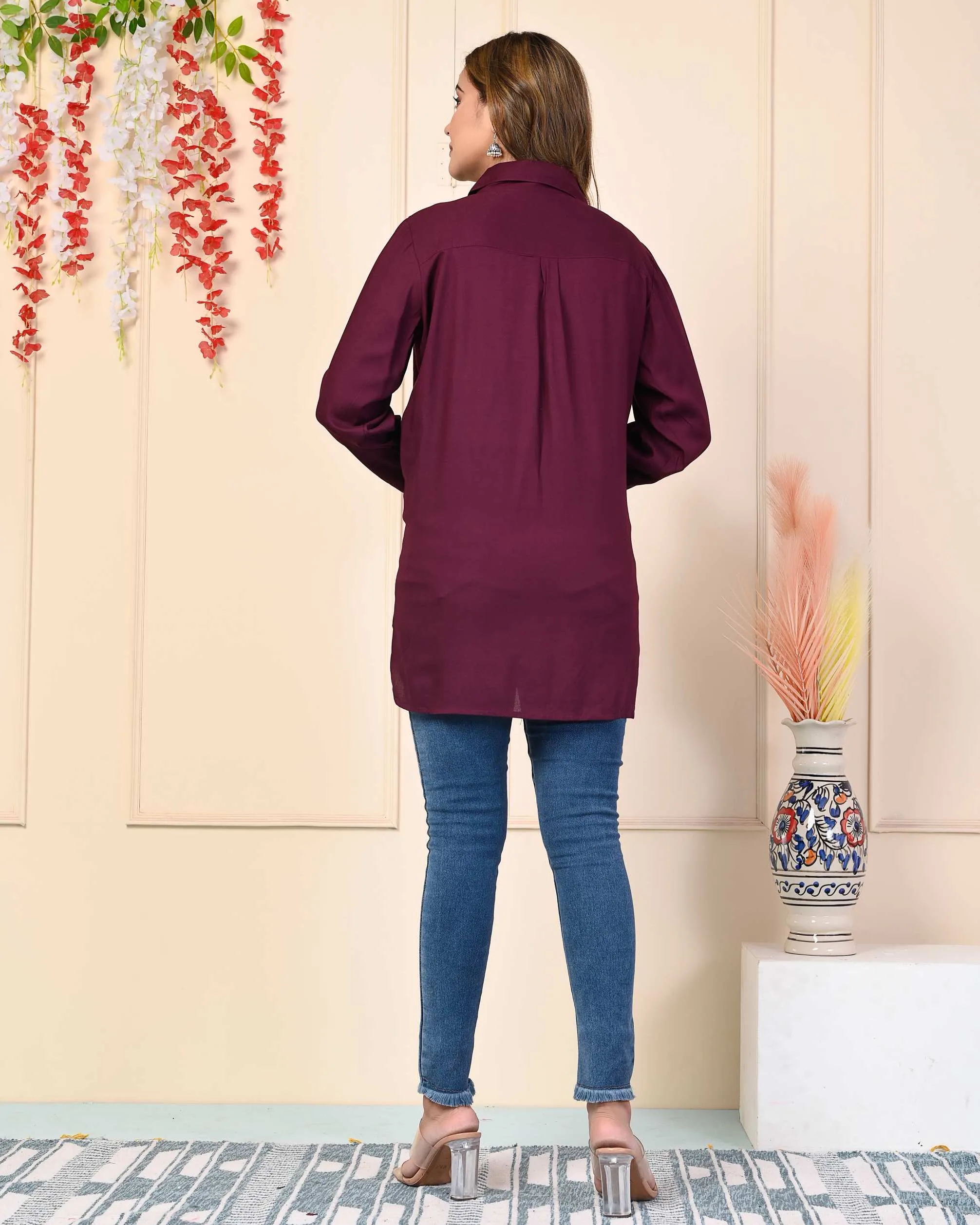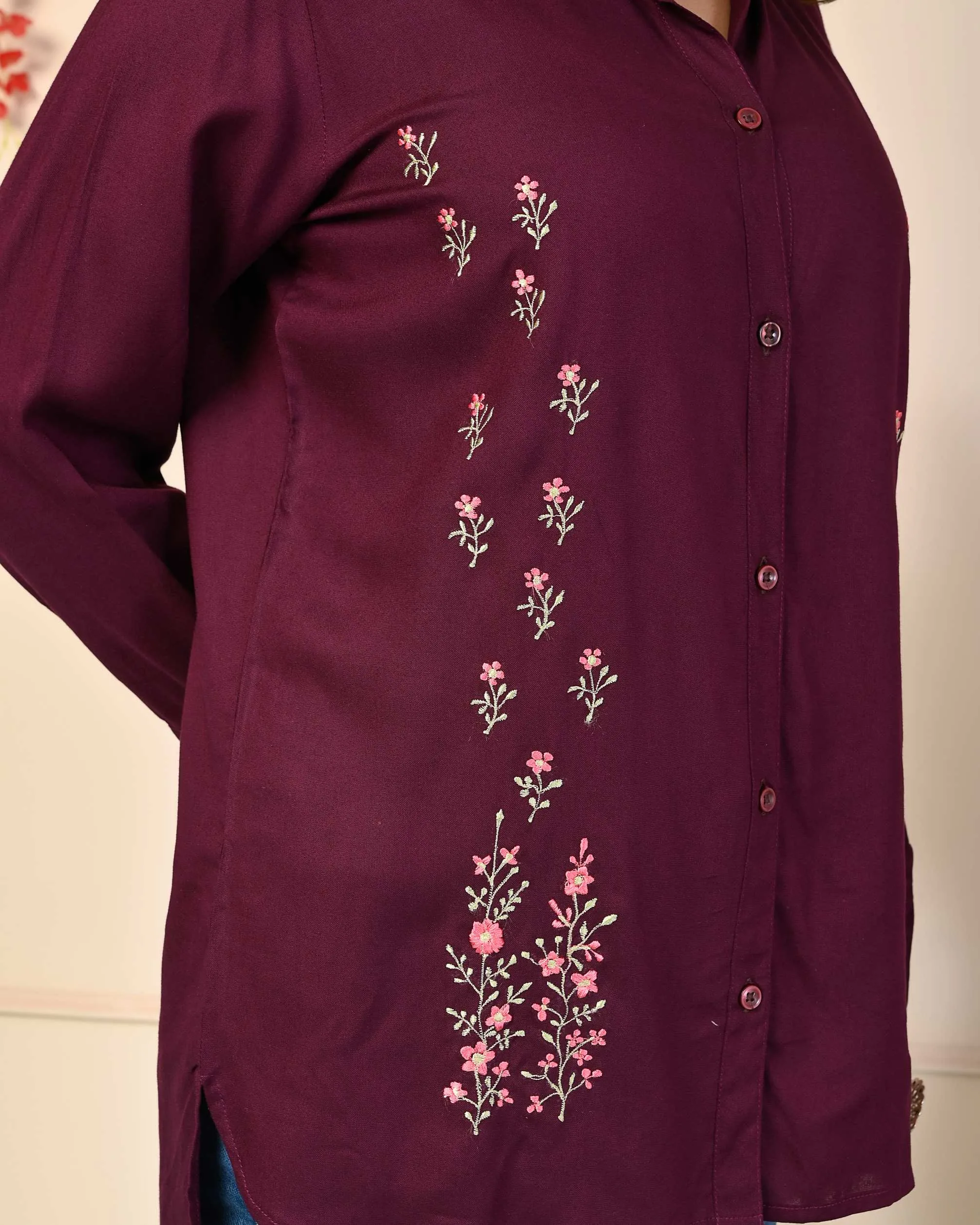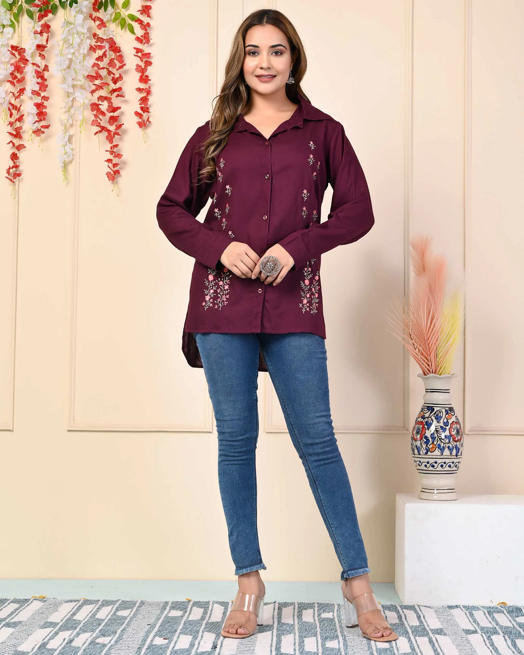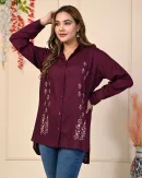 Very elegant and stylish range from Kritvi tops, made up of rayon fabric, makes it comfortable and wearable for office purpose or any casual outing, it has apple bottom cut and shirt button up pattern with shirt collard neck. Pair it up with your favorite denim or white pant for stunning look. It has a nice colourfull thread embroidery.